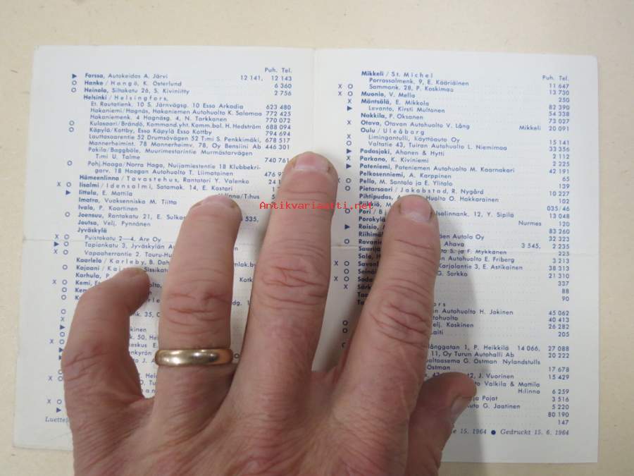 | Saatavilla | 1 kpl | | Julkaisuvuosi | 196? | | Sivuja | 4 | | Kunto | K2 | | Sidonta/painoasu | Pienpainate | | Kielet | Suomi, Ruotsi, Englanti, Saksa |