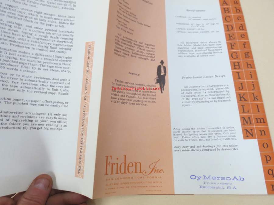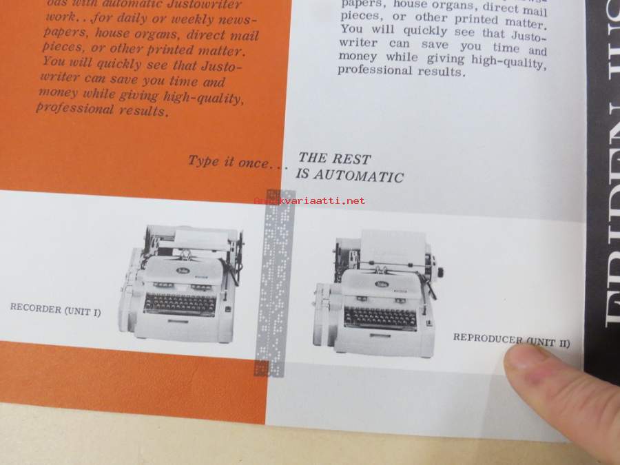 Friiden Justowriter -myyntiesite, kirjoituskone / reikänauhataltiointi / kopiointikone