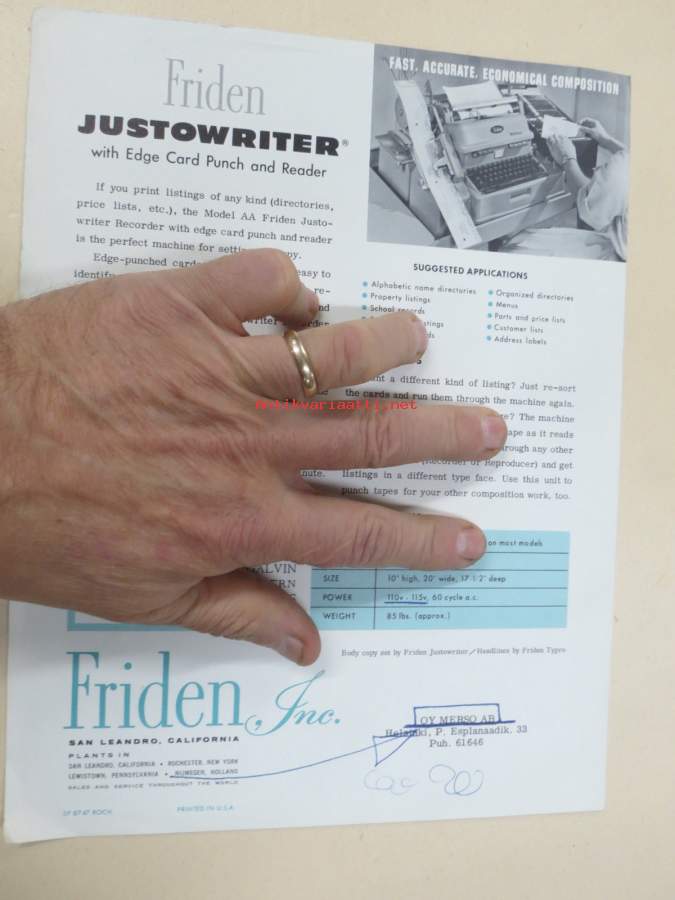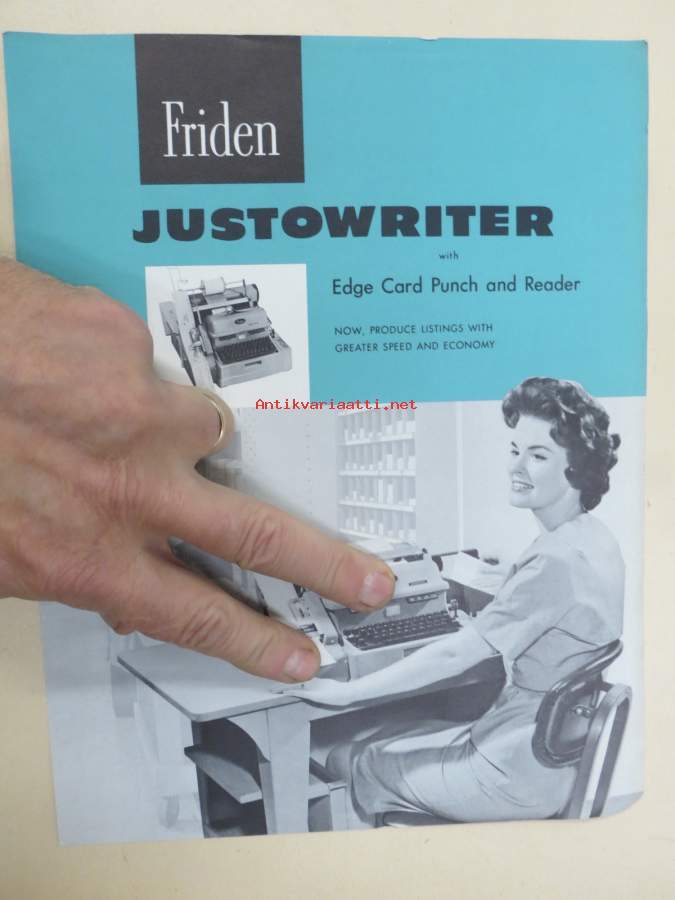 Friiden Justowriter - Edge Card Punch and Reader -myyntiesite, kirjoituskone / reikäkorttitaltiointi / kopiointikone