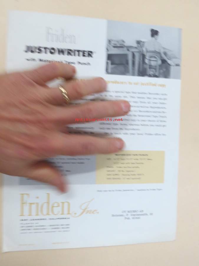 Friiden Justowriter - With Motorized Tape Punch -myyntiesite, kirjoituskone / moottoroitu reikänauhataltiointi