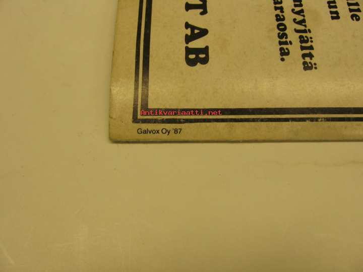 | Saatavilla | 1 kpl | | Julkaisuvuosi | 1987 | | Sivuja | 20 | | Kunto | K3 | | Sidonta/painoasu | Nidottu (pehmeäk.) | | Kielet | Suomi |