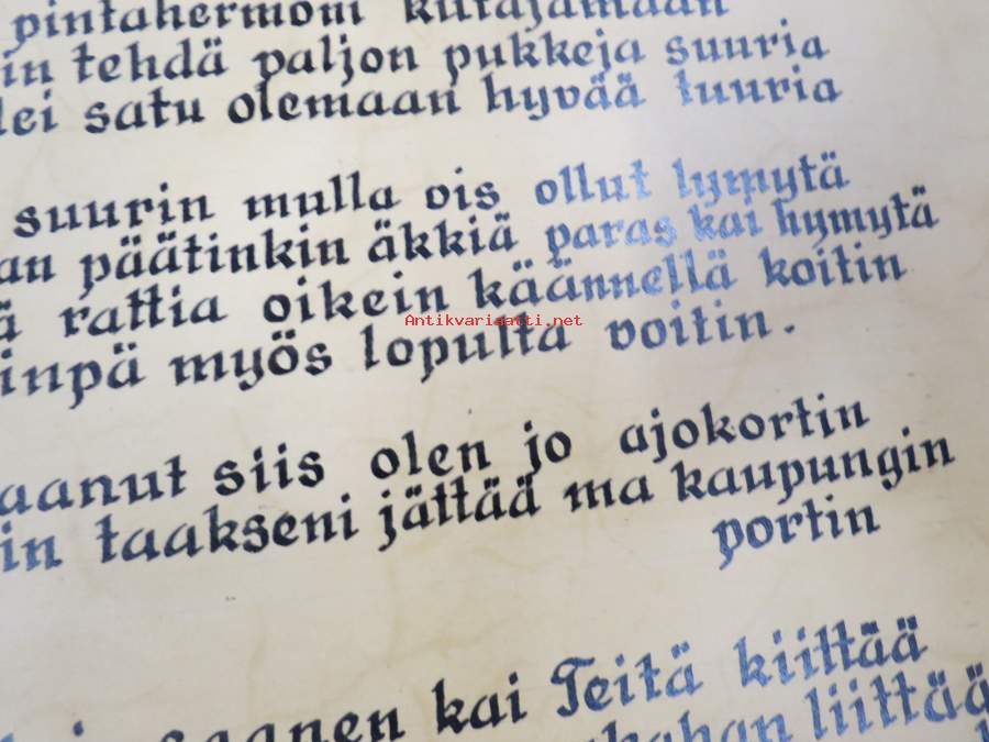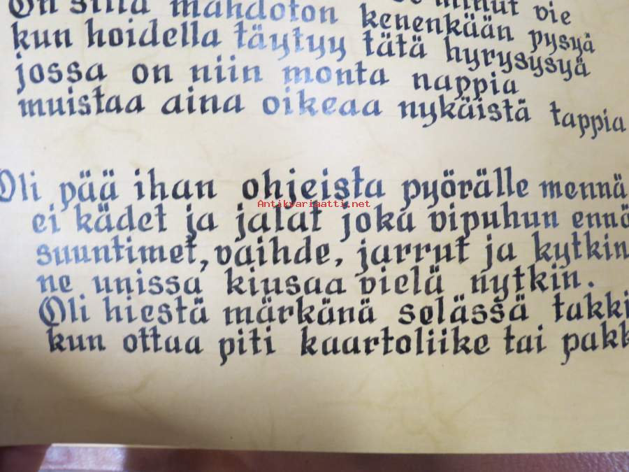 | Saatavilla | 1 kpl | | Kunto | K3 | | Sidonta/painoasu | Valokuva |