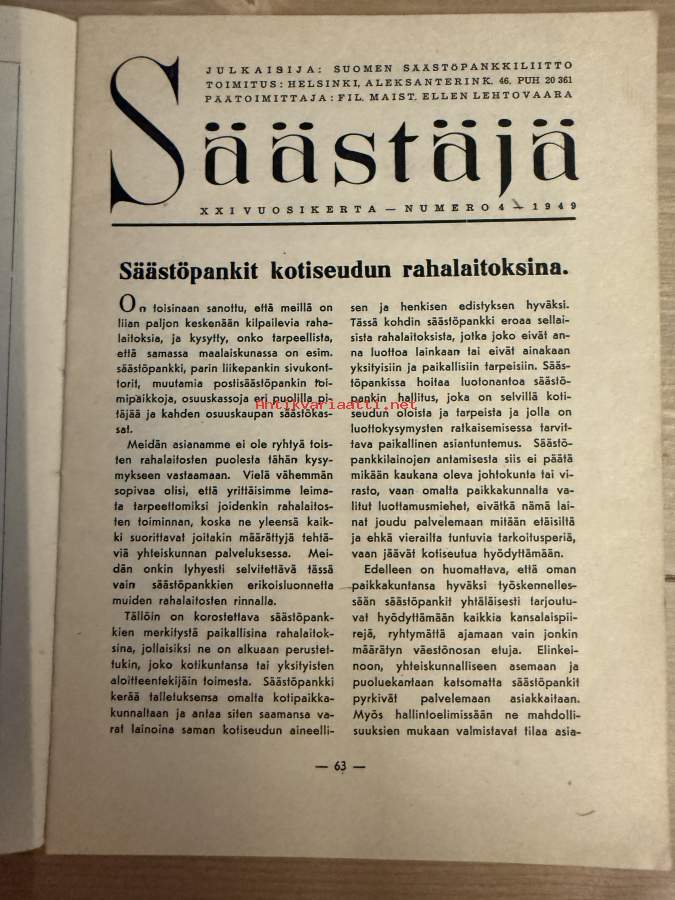 Säästäjä 1949 nr 4 -säästöpankkien asiakaslehti, artikkeleita, sarjakuvia yms.