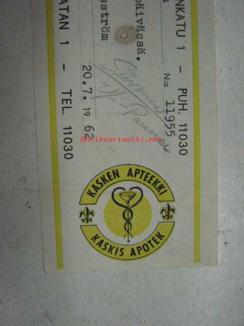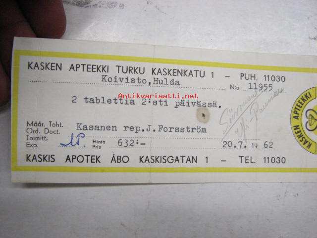 Kasken Apteekki, Turku, 20.7.1962 -apteekkisignatuuri