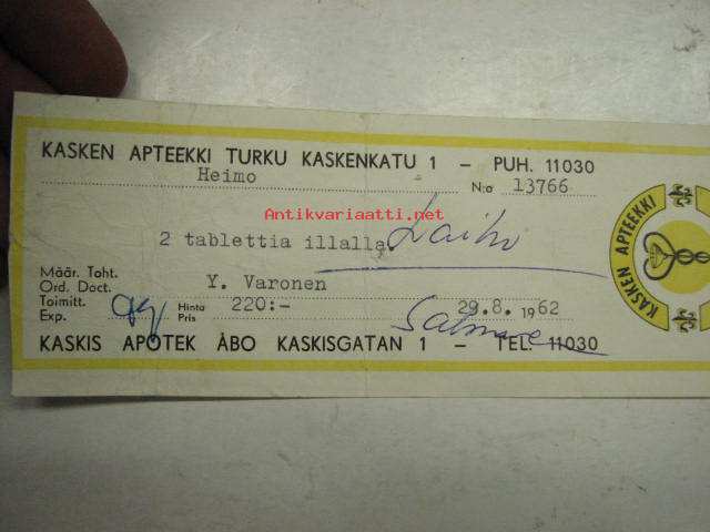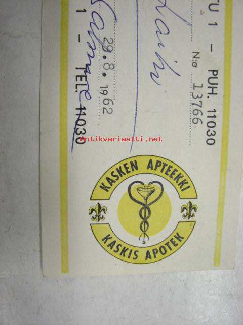 Kasken Apteekki, Turku, 29.8.1962 -apteekkisignatuuri