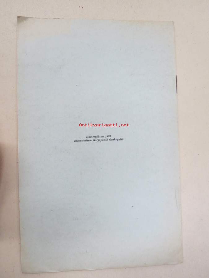 | Saatavilla | 1 kpl | | Julkaisuvuosi | 1931 | | Sivuja | 12 | | Kunto | K3 | | Sidonta/painoasu | Nidottu (pehmeäk.) | | Kielet | Suomi |