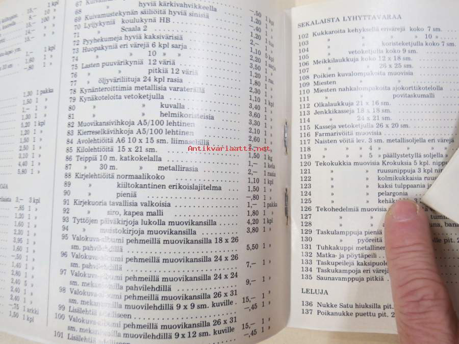 N. Järvinen, 197215 x 21 cm, kortteja tarvikkeita, leluja (mm. nuket, autot ym.)