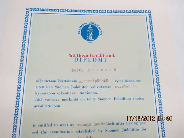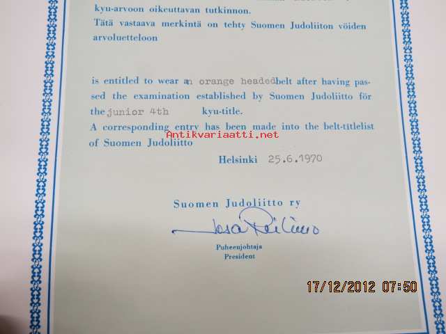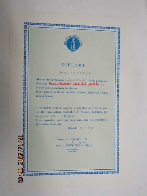 Suomen Judoliitto, Diplomi, Matti Niemelä oikeutetaan käyttämään oranssipäistä vyötä... nuorten 4. kyu-arvoon oikeuttavan tutkinnon, 25.6.1970