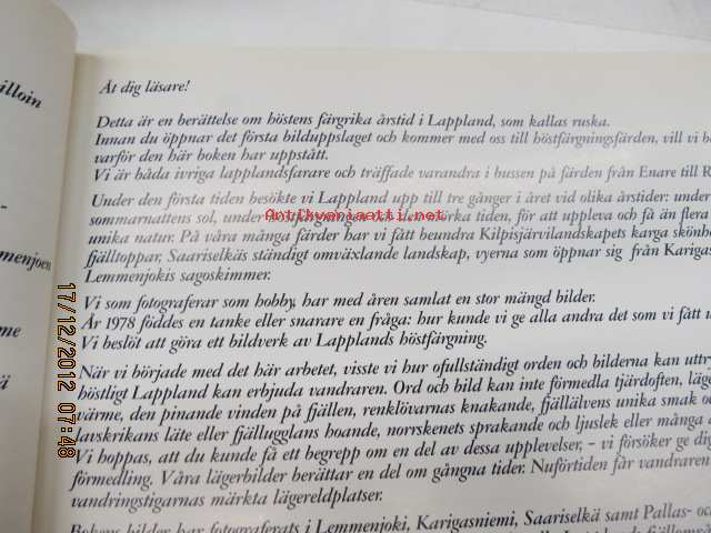 | Saatavilla | 1 kpl | | Sivuja | 72 | | Painos | 1. | | Kunto | K3 | | Sidonta/painoasu | Sidottu (kansipaperit) | | ISBN | 951-9089-80-2 | | Kielet | Suomi, Ruotsi, Englanti, Saksa |