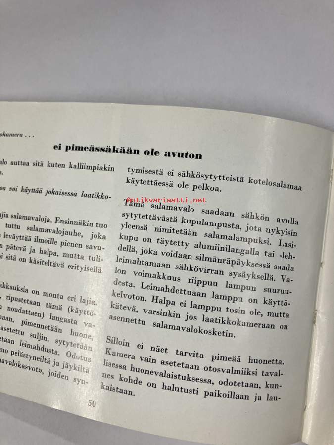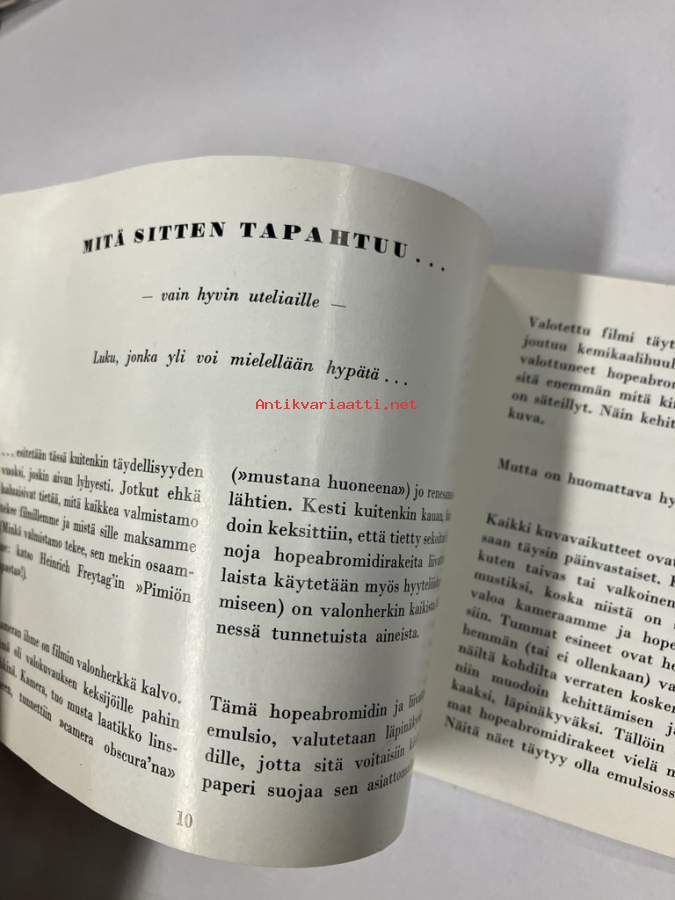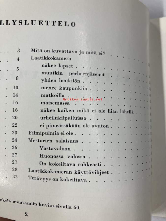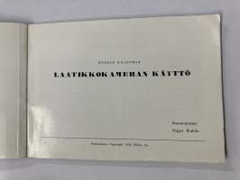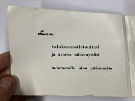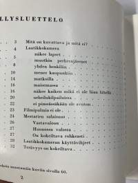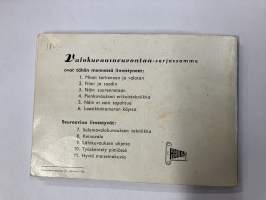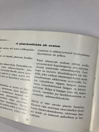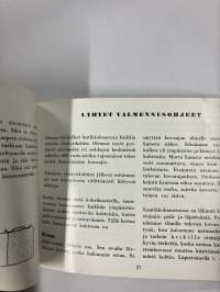 | Saatavilla | 1 kpl | | Julkaisuvuosi | 1956 | | Sivuja | 64 | | Painos | 1. | | Kunto | K2 | | Kannet huonokuntoiset | | Sidonta/painoasu | Nidottu (pehmeäk.) | | Kielet | Suomi |