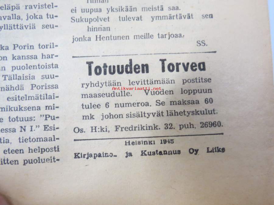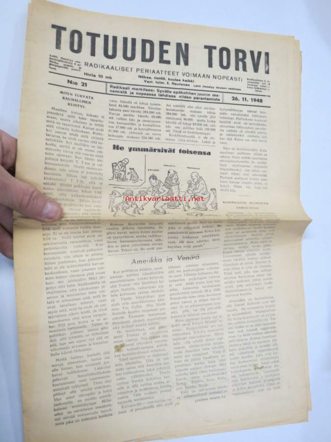 Totuuden Torvi 1948 nr 21, Ernesti Hentunen, Radikaalinen kansanpuolue -julkaisu, paljastuksia, skandaaleja, äärioikeiston naamioitumispyrkimyksiä, ym.