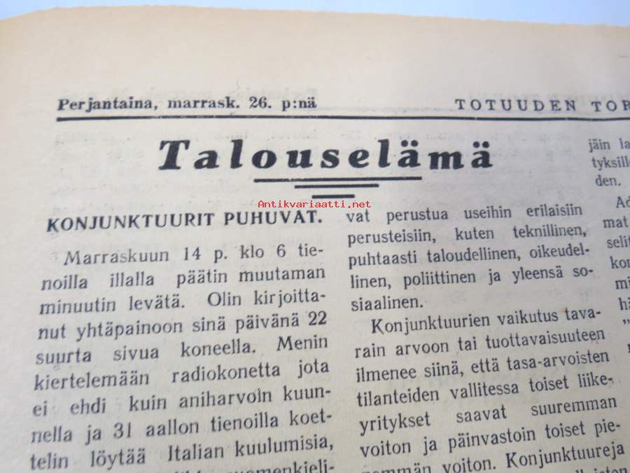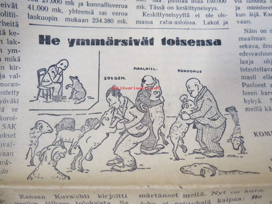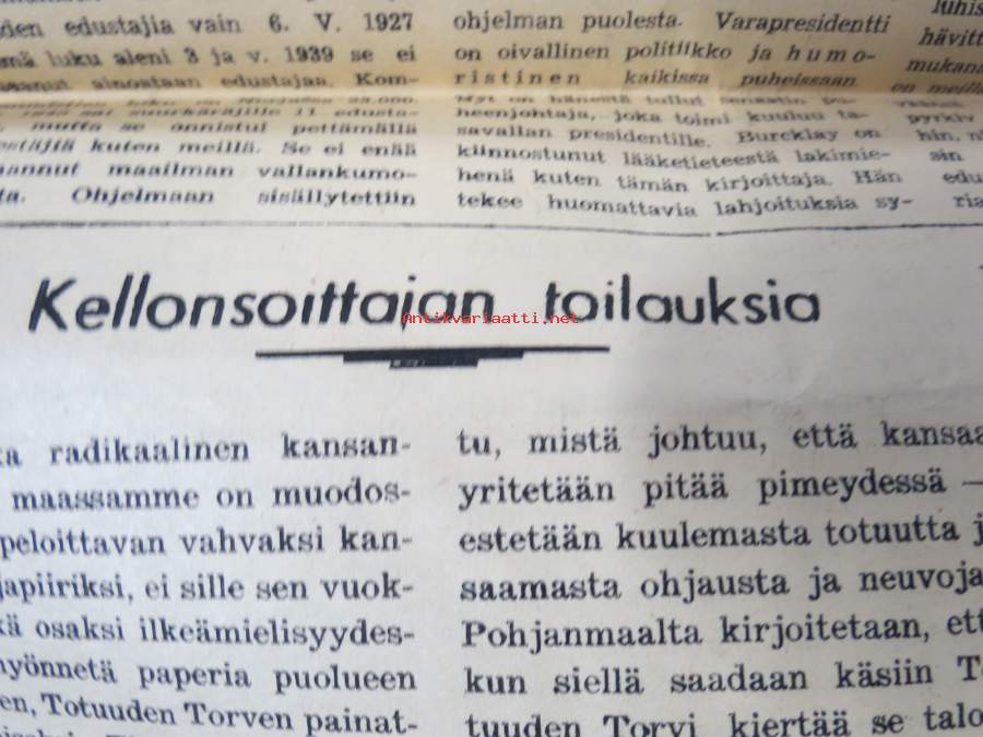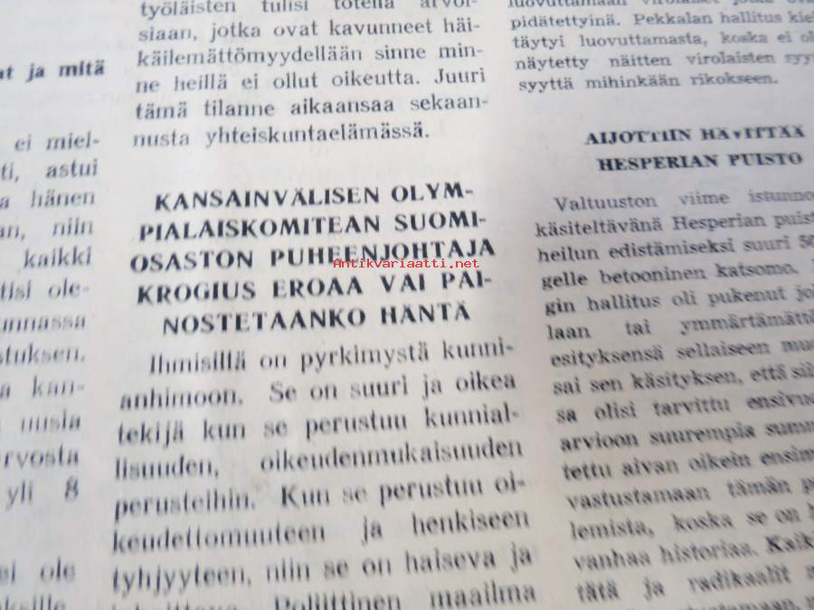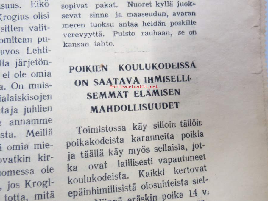 Poikien koulukodeissa on saatava ihmisellisemmät elämisen mahdollisuudet, Miten ratkaista ruotsalasiten maanasia, Yhteiskunnallista mädännäisyyttä, ym. Päätoimittaja Ernesti Hentunen, puolueensa äänenkannattaja, sisältää hyvinkin yksityiskohtaisia ja avoimia paljastuksia sekä syytöksiä yksityishenkilöistäkin.