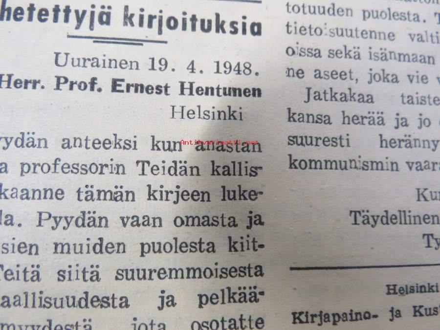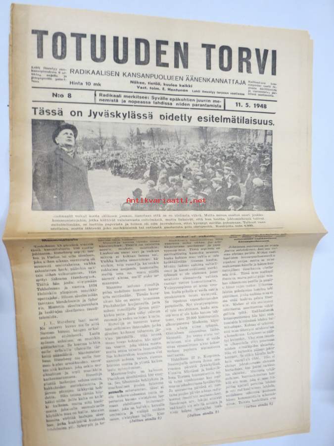 Totuuden Torvi 1948 nr 8, Ernesti Hentunen, Radikaalinen kansanpuolue -julkaisu, paljastuksia, skandaaleja, äärioikeiston naamioitumispyrkimyksiä, ym.