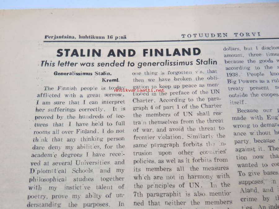 Totuuden Torvi 1948 nr 6, Ernesti Hentunen, Radikaalinen kansanpuolue -julkaisu, paljastuksia, skandaaleja, äärioikeiston naamioitumispyrkimyksiä, ym.