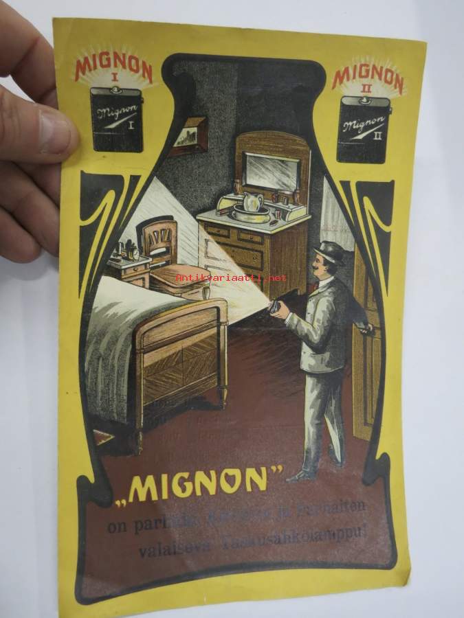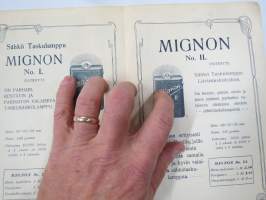 Mignon I & II Taskusähkölamppu "suositellaan herroille Urheilioille, Sotilaille ja Virkamiehille" + Astrid, Sigrid & Ingrid sähkölamput -myyntiesite