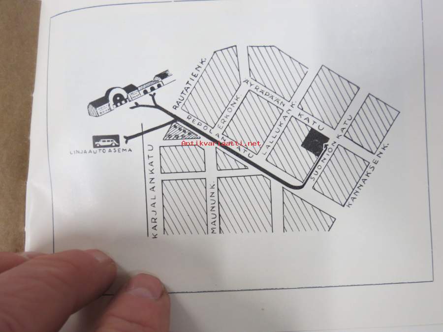 | Saatavilla | 1 kpl | | Julkaisuvuosi | 19?? | | Sivuja | 8 | | Kunto | K3 | | Sidonta/painoasu | Pienpainate | | Kielet | Suomi |