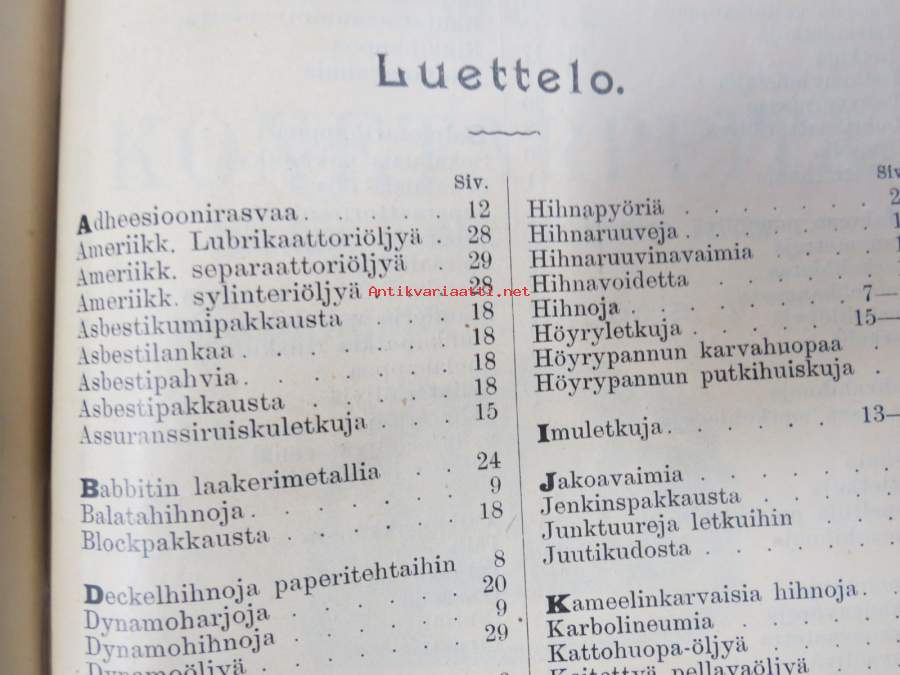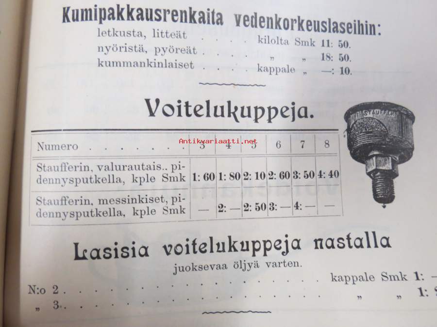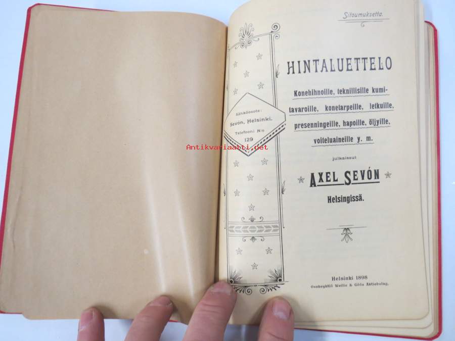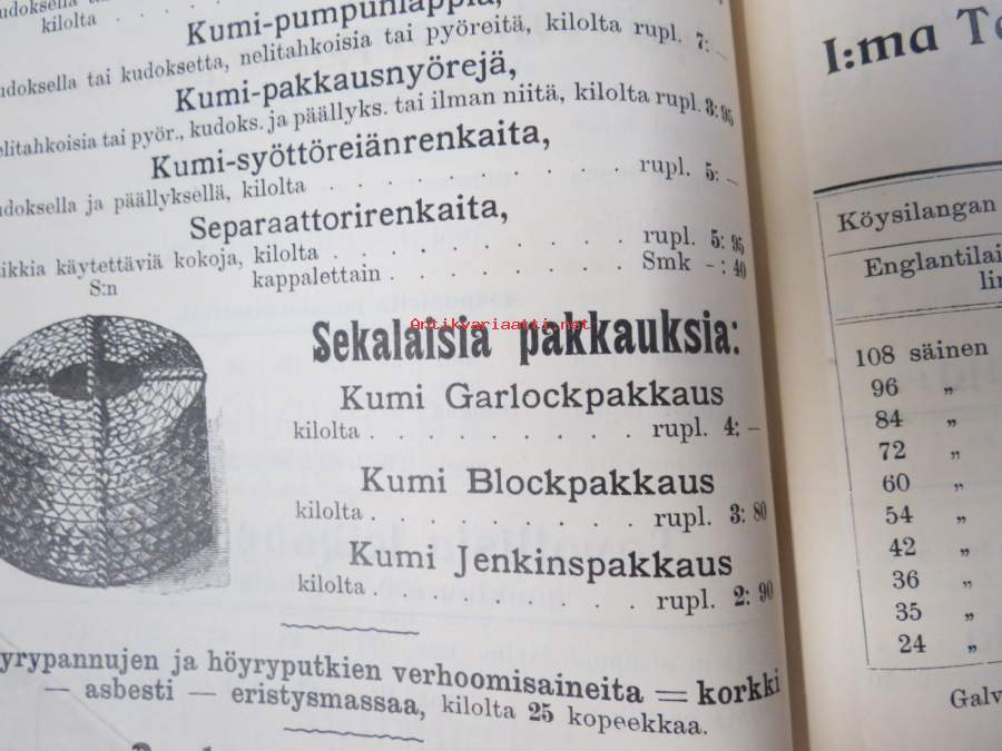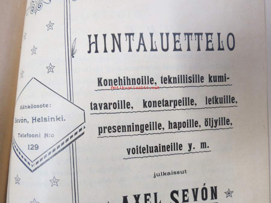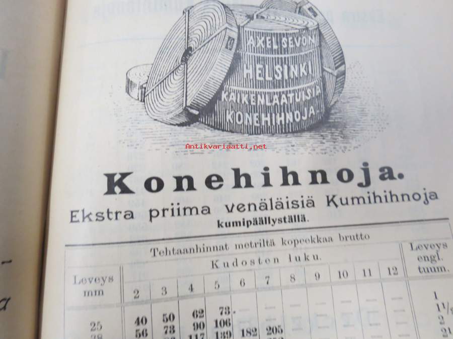 Hintaluettelo Axel Sevónilta konehihnoille, teknisille kumitavaroille, konetarpeille,letkuille... 1898 -tuoteluettelo, tämä kappale "Kymmene Aktiebolag" nimetty