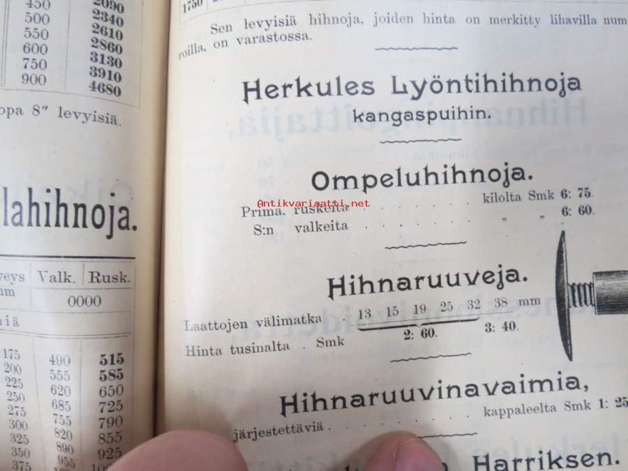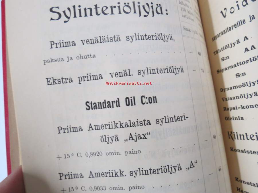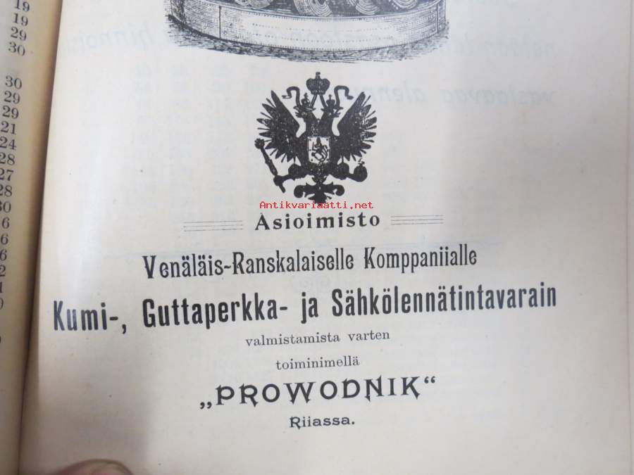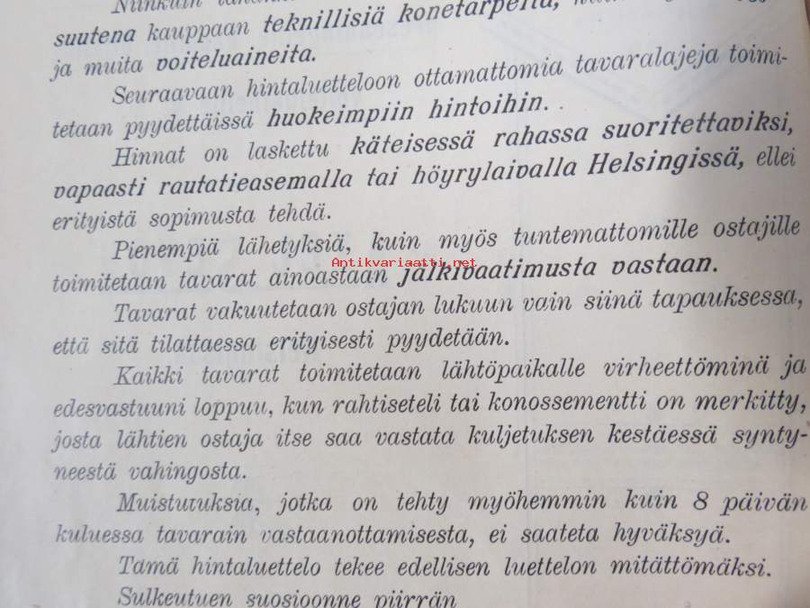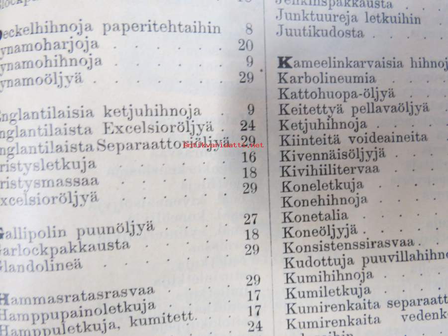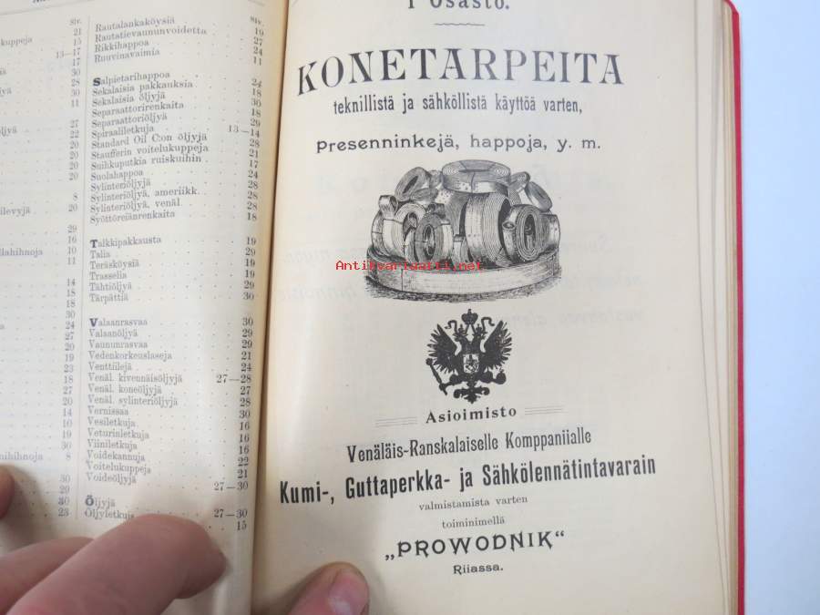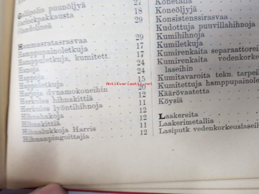 Hintaluettelo Axel Sevónilta konehihnoille, teknisille kumitavaroille, konetarpeille,letkuille... 1898 -tuoteluettelo, tämä kappale "Kymmene Aktiebolag" nimetty