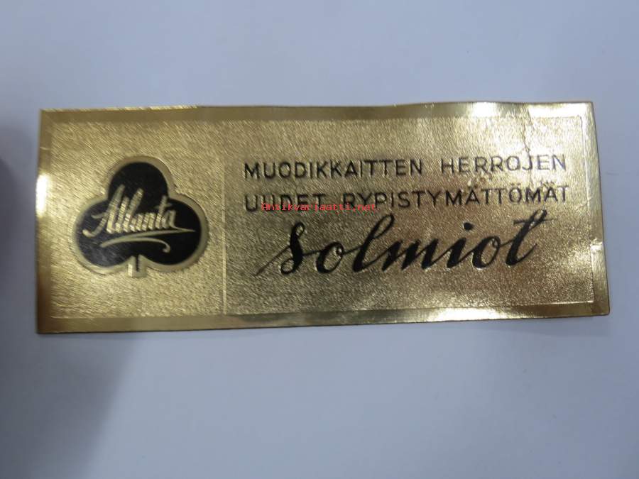 Atlanta - Muodikkaitten herrojen uudet rypistymättömät solmiot -hintalappu / tuotetietolappu, merkin valmistaja Herman Mattsson Korkokuvapaino & Pussitehdas, Vaasa