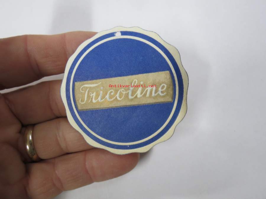 Tricoline -hintalappu / tuotetietolappu, merkin valmistaja Herman Mattsson Korkokuvapaino & Pussitehdas, Vaasa