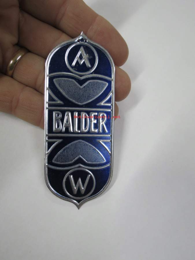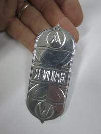 Balder A - W -polkupyörän merkki, metallia, merkin valmistaja Herman Mattsson Korkokuvapaino & Pussitehdas, Vaasa