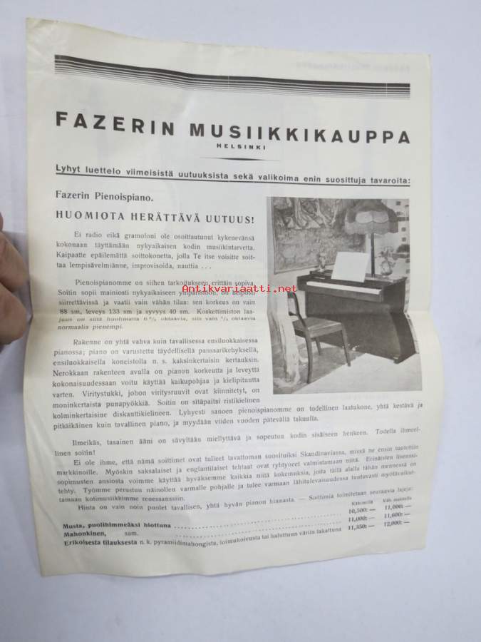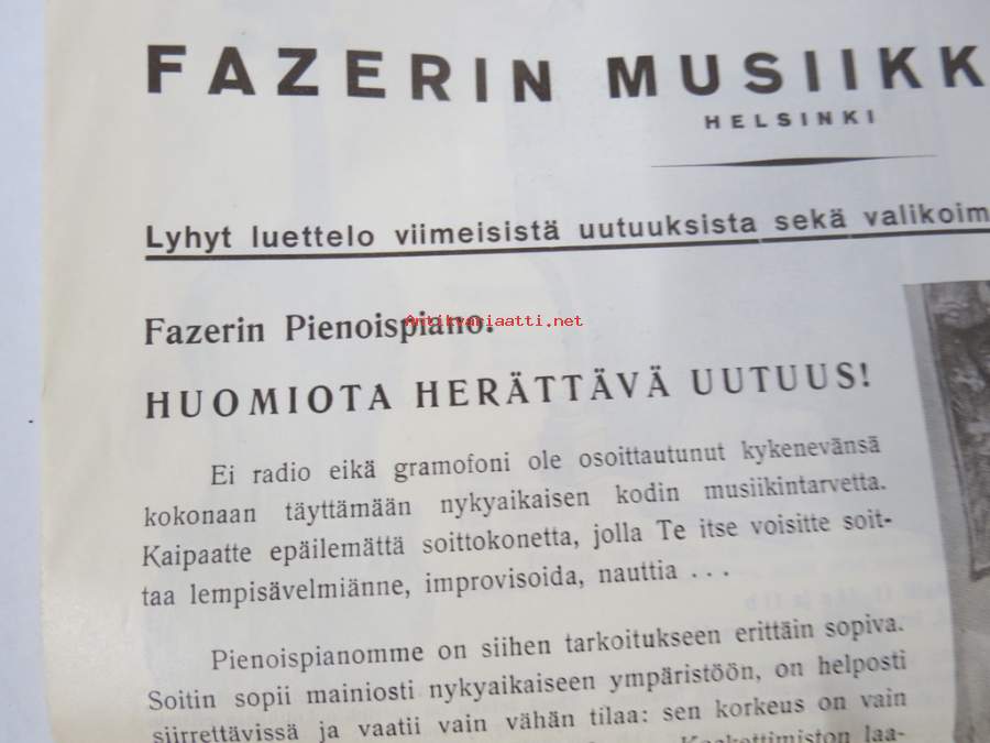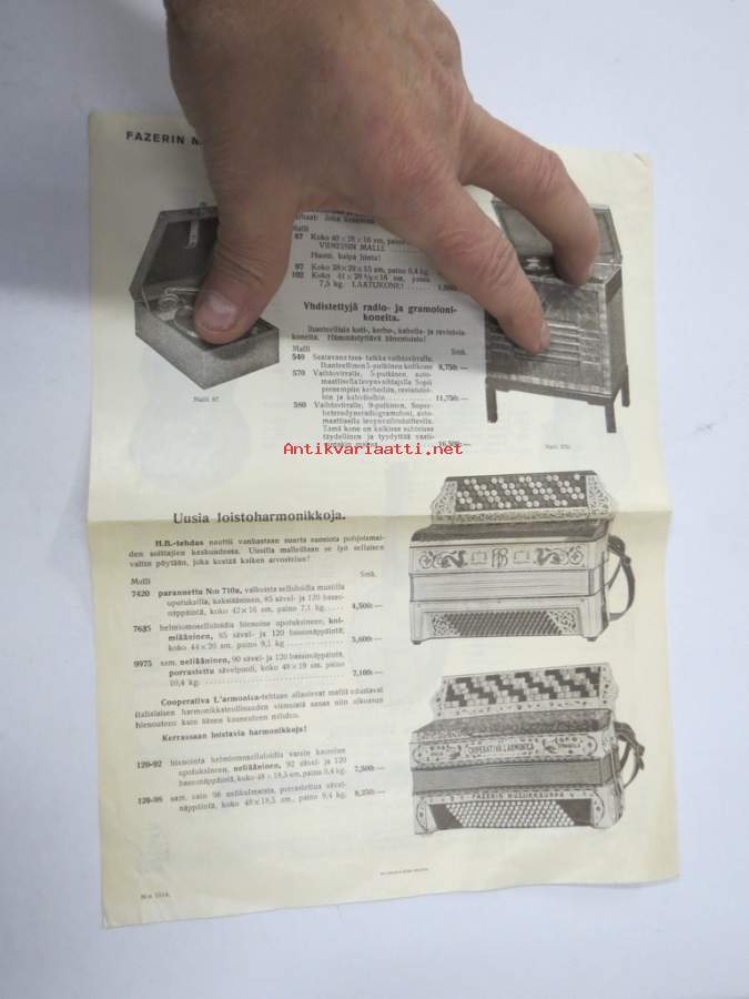 Fazerin Musiikkikauppa - lyhytluettelo; Pienoispiano, Kangasala-Fazer urkuharmoonit, Viulut, Kanteleet, Banjot, His Masters Voice matkagramofoneja, HB-Harmonikkoja