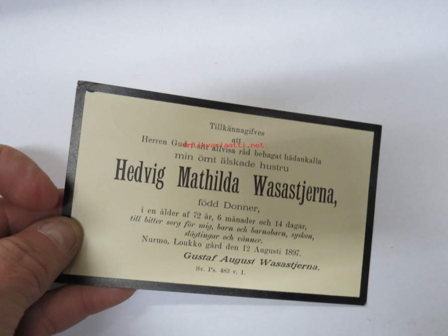 Hedvig Mathilda Wasastjerna, född Donner... råd behagat hädankalla... Nurmo, Loukko Gård den 12 Augusti 1897 -ilmoituskortti kuolemantapauksesta