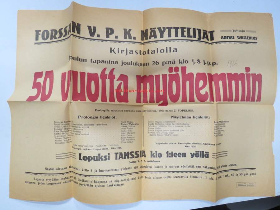 Forssan V.P.K. näyttelijät 26.12.21916 "50 vuotta myöhemmin" -näytelmä ja tanssitilaisuuden juliste