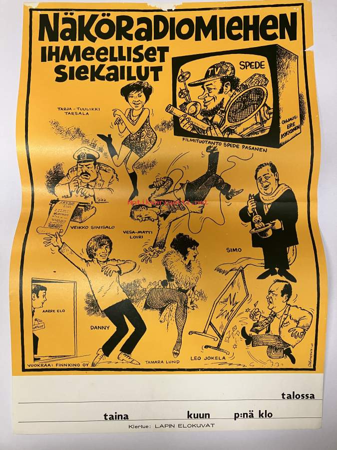 Näköradiomiehen ihmeelliset siekailut, Spede Pasanen, Aarre Elo, Danny, Tamara Lund, Leo Jokela, Simo Salminen, Vesa-Matti Loiri, Veikko Sinisalo, Tarja-Tuulikki Tarsala, ohjaus Ere Kokkonen -elokuvajuliste / movie poster 40 x 60 cm. Kiertueversio.