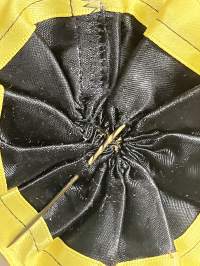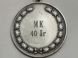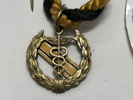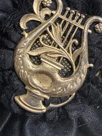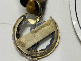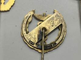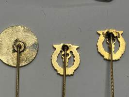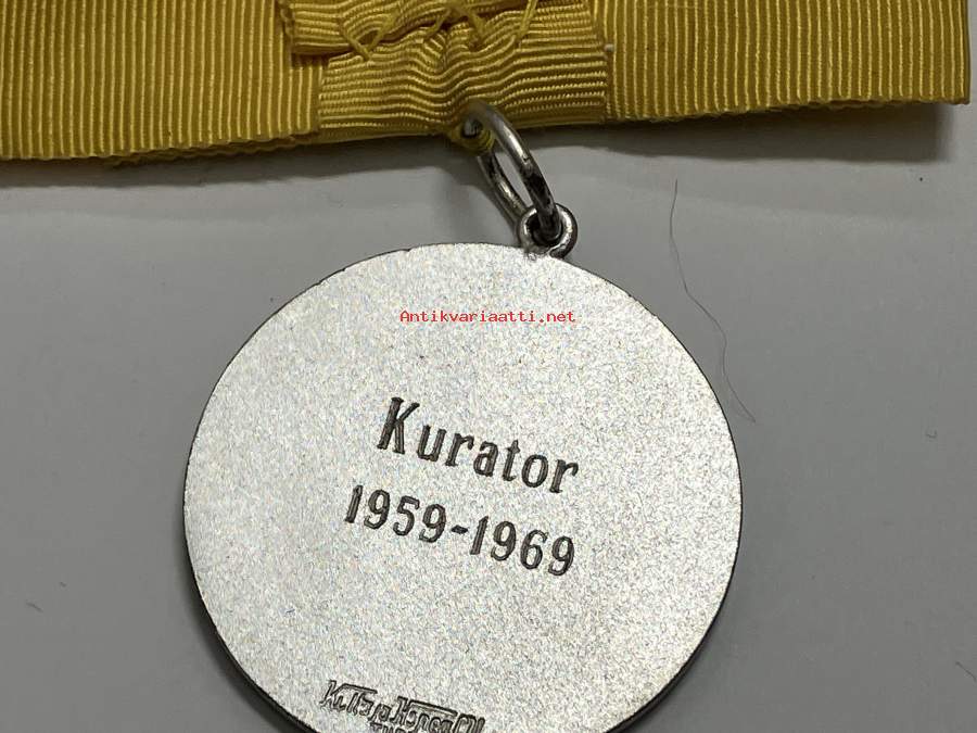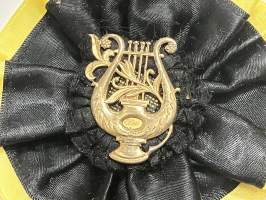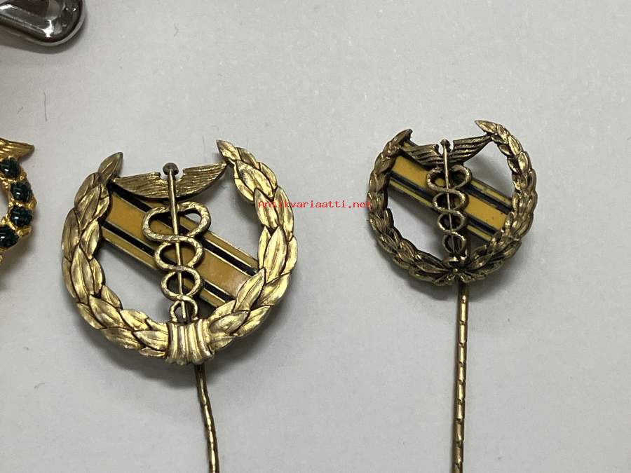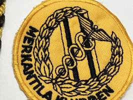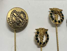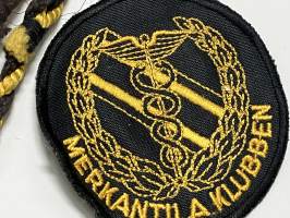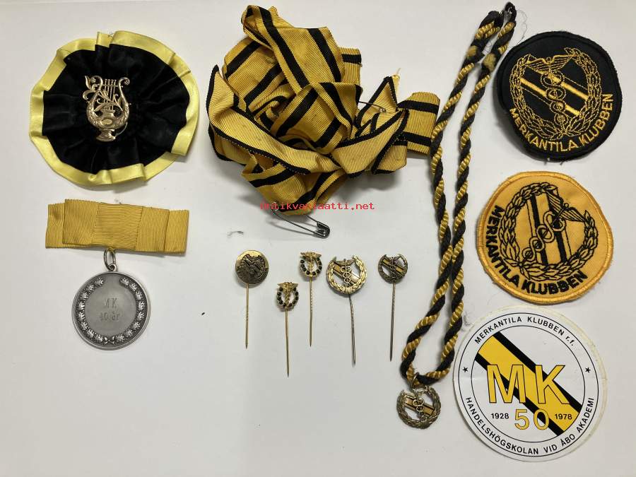 Merkantila klubben Åbo Akademi -erä sen toimintaan liittyviä yhden henkilön merkkejä; Ruusuke, kaulariipus, neulamerkit, mitali, kangasmerkit, tarra -osa hopeaa