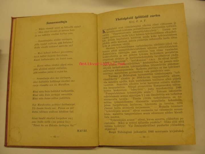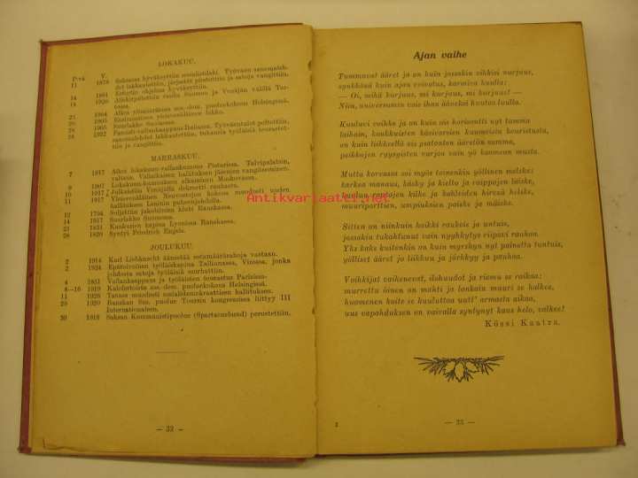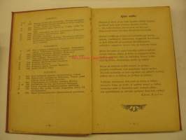 | Saatavilla | 1 kpl | | Julkaisuvuosi | 1928 | | Sivuja | 189 | | Painos | 1. | | Kunto | K2 | | muutamia sivuja irti | | Sidonta/painoasu | Sidottu (kovak.) | | Kielet | Suomi |