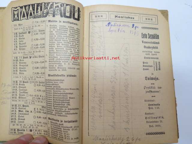 Kansanvalistusseuran Kalenteri 1919, sis. runsaasti mainoksia, artikkeleita, tilastotietoa, rautateitten ja postin kulku, virkamiehistö, puolueet,