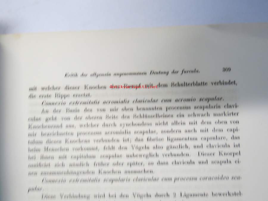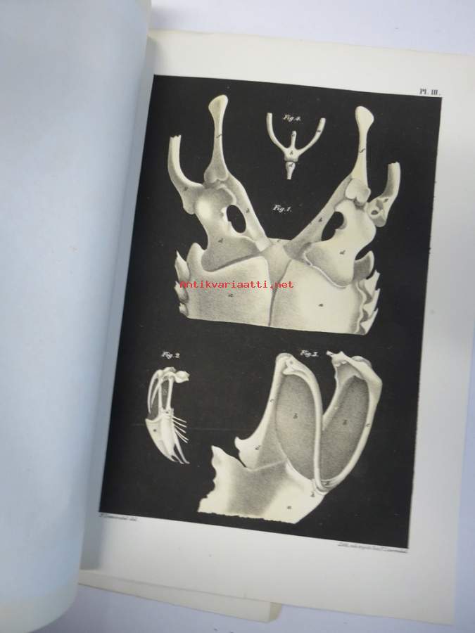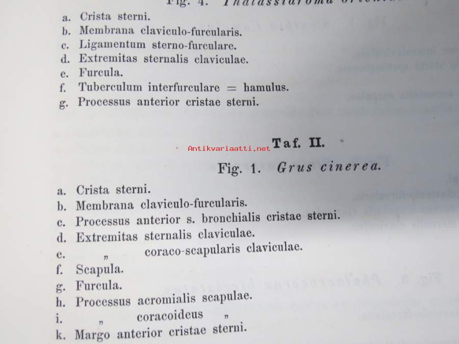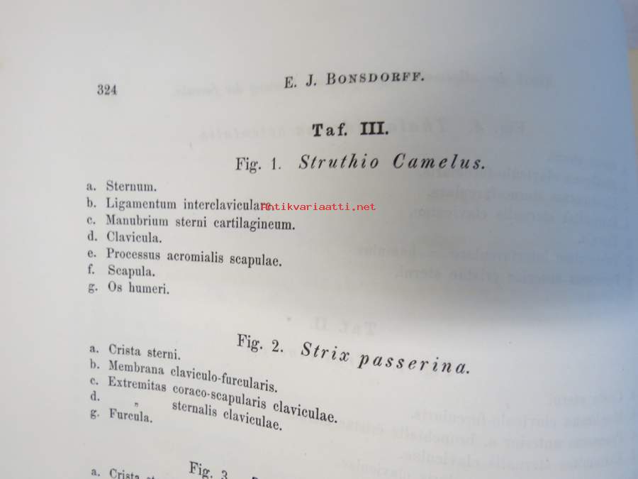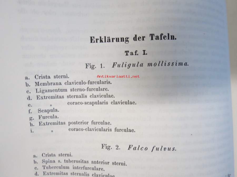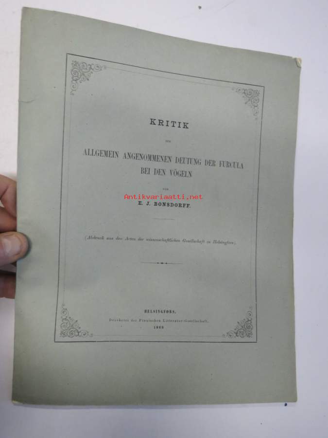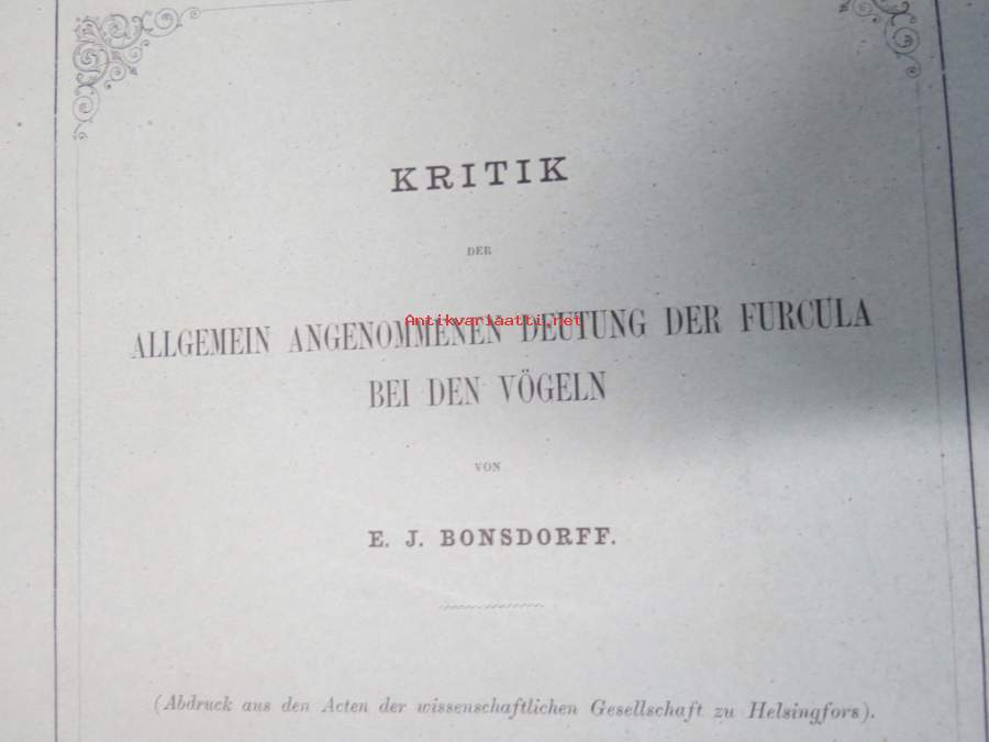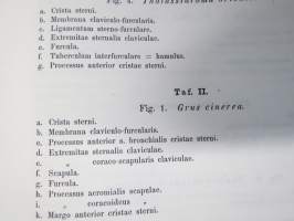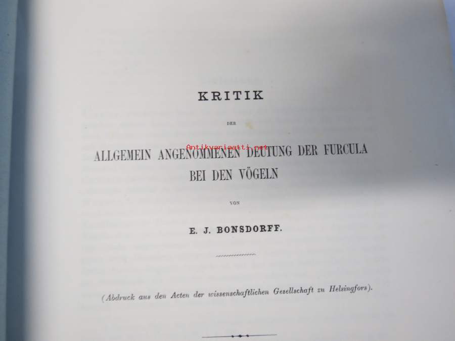 Kritik der allgemein angenommen Deutung der Furcula bei den Vögeln von E.J. Bonsdorf -eripainos 1869 -lintuihin liittyvä tieteellinen tutkielma, 4 liitekuvaa