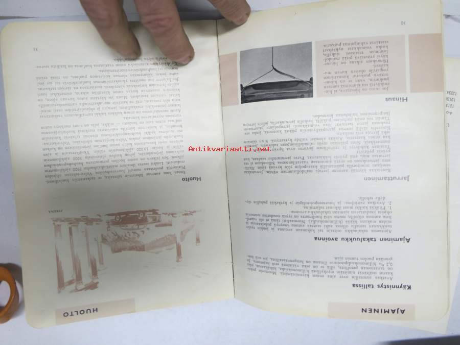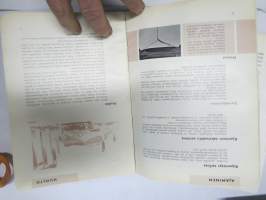 | Saatavilla | 1 kpl | | Julkaisuvuosi | 1965 | | Sivuja | 62 | | Kunto | K2 | | Kulunut, käytössä ollut | | Sidonta/painoasu | Nidottu (pehmeäk.) | | Kielet | Suomi |