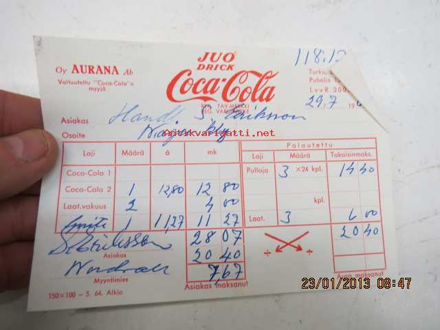 Aurana Oy Coca-Cola toimituskuitti 1965