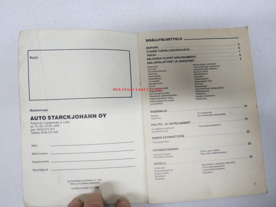 | Saatavilla | 1 kpl | | Julkaisuvuosi | 1990 | | Sivuja | 66 | | Kunto | K2 | | Sidonta/painoasu | Nidottu (pehmeäk.) | | Kielet | Suomi |