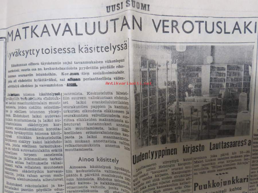 Uusi Suomi la 19.5.1951, Alfred S.M. Töyrä taiteilija Amerikasta, Lemillä miljoonapalo tulitikkuleikeistä, Matkavaluutan verotuslaki, Picada Finlandes Argentiinassa