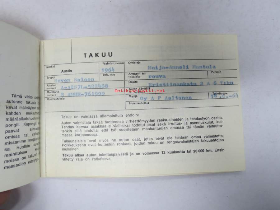Veho - Takuu- ja huoltokirja, Austin Seven Saloon 1964