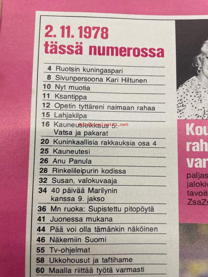 Me Naiset 1978 nr 44 (2.11.), Silvia, Anu Panula, Rinkelileipurin kotona (Vera Resenkov), Seppo Ruohonen, Mustiala, neljäkymmentä päivää Marilynin kanssa 9.osa