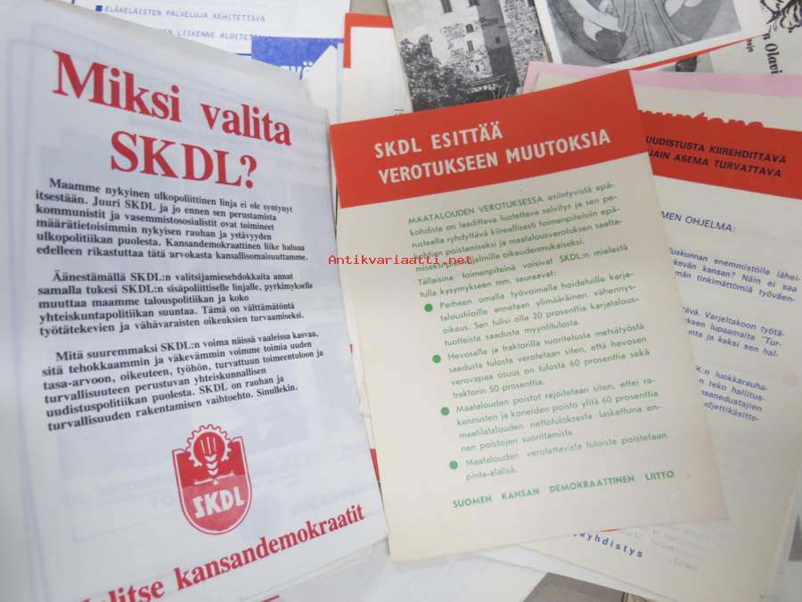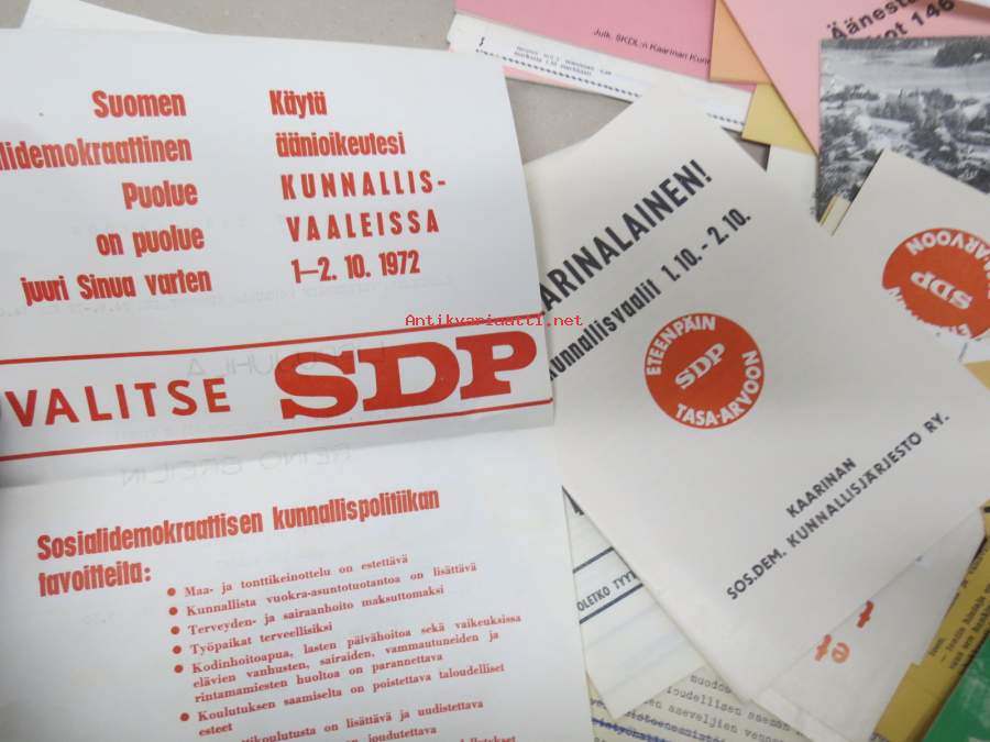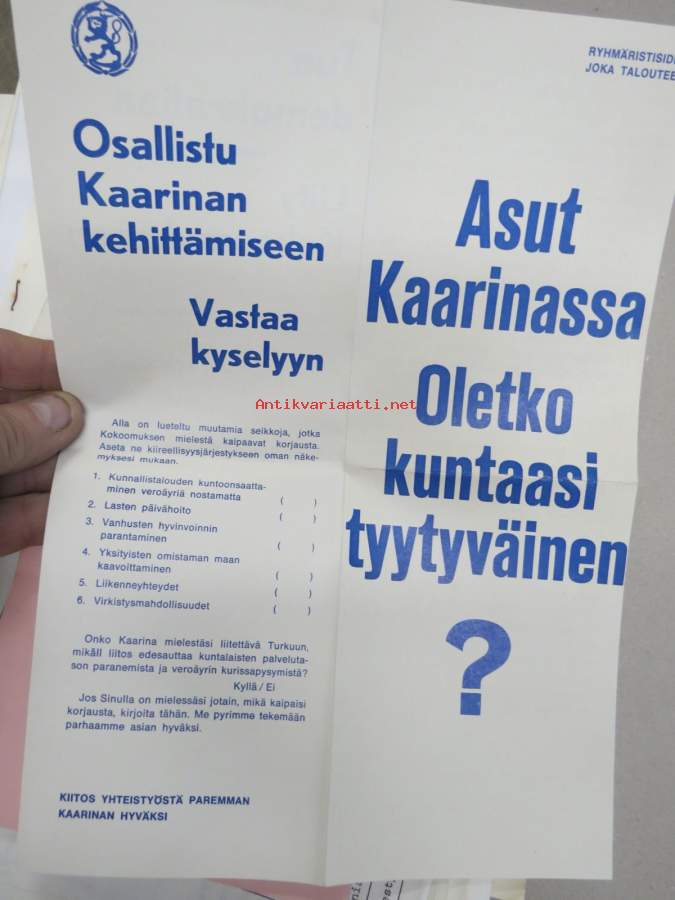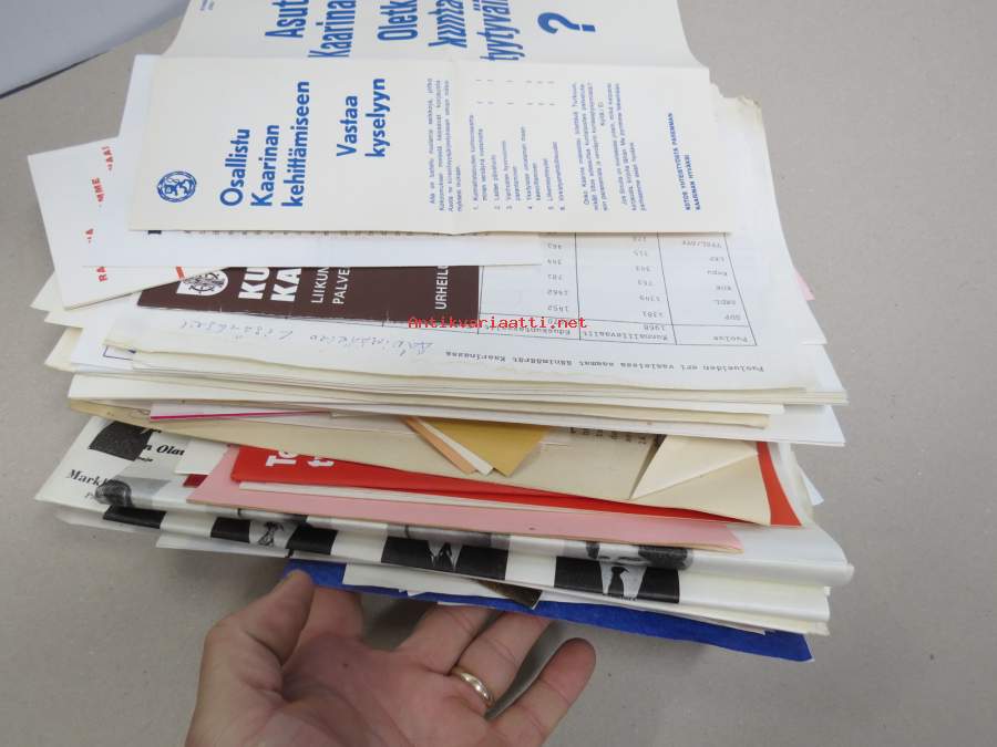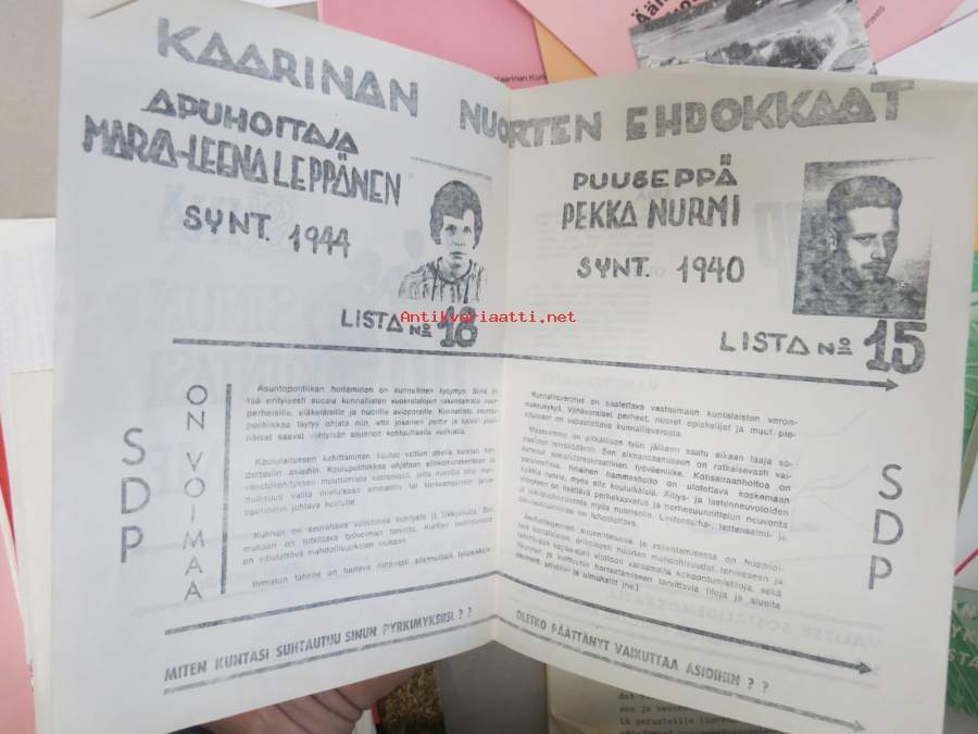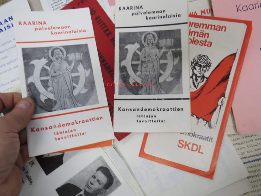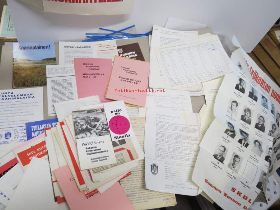 Monenlaisia mainoksia, asiakirjoja, poliittisia ja kunnallisiakin jukaisuja tavoitteena vasemmistolainen Kaarina, paria isoa ehdoasasettelujulistetta ym.