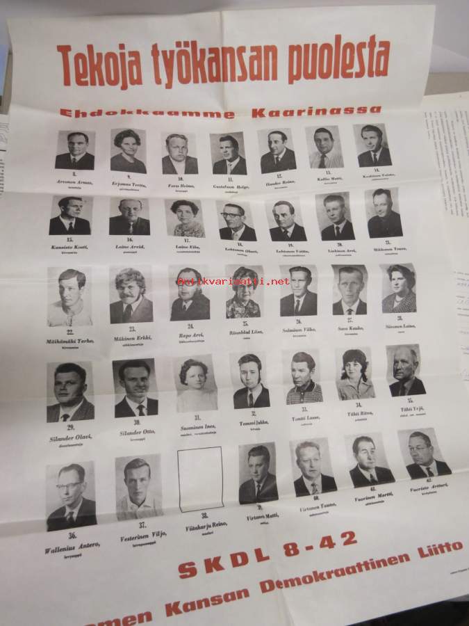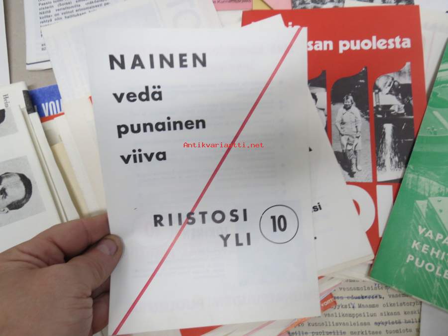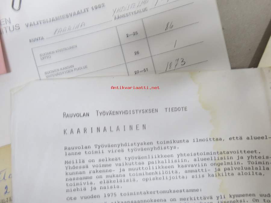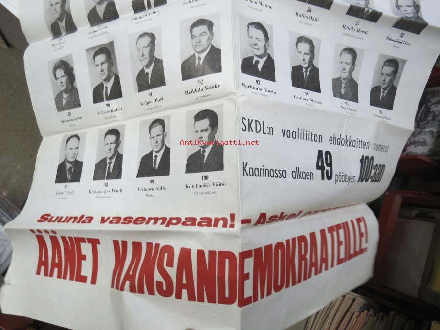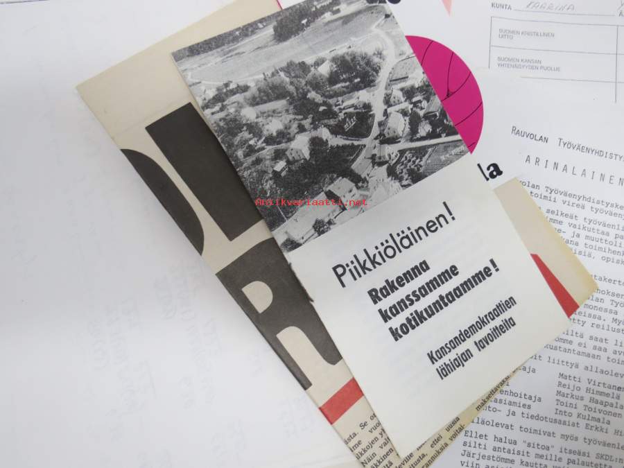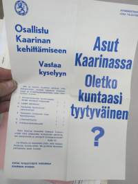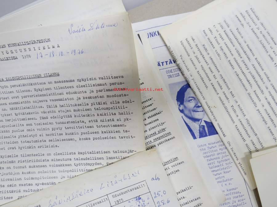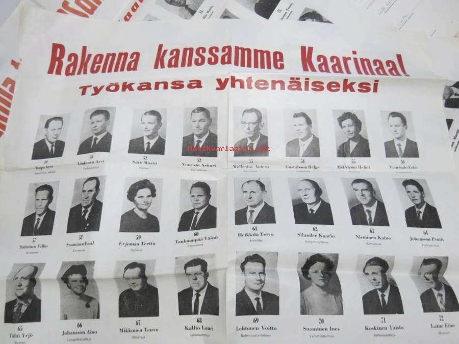 Monenlaisia mainoksia, asiakirjoja, poliittisia ja kunnallisiakin jukaisuja tavoitteena vasemmistolainen Kaarina, paria isoa ehdoasasettelujulistetta ym.
