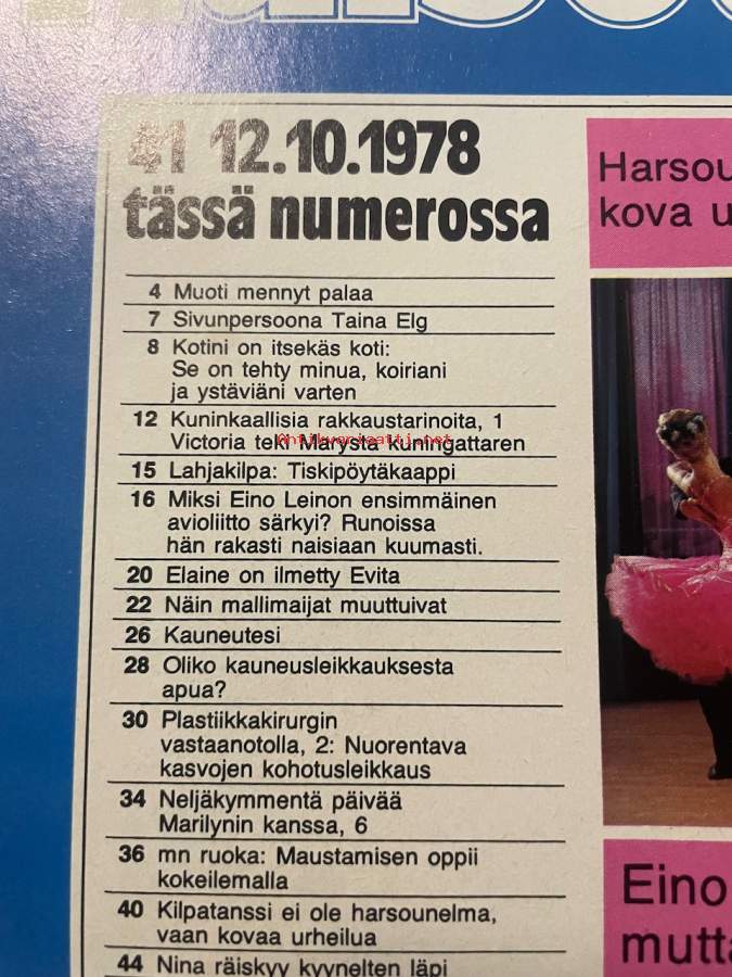 Me Naiset 1978 nr 41 (12.10), Kirsti Paakkasen koti, Sivun persoona Taina Elg, Eino Leino, näin Mallimaijat muuttuivat, 40 päivää Marilynin kanssa 0sa 6, kilpatanssi