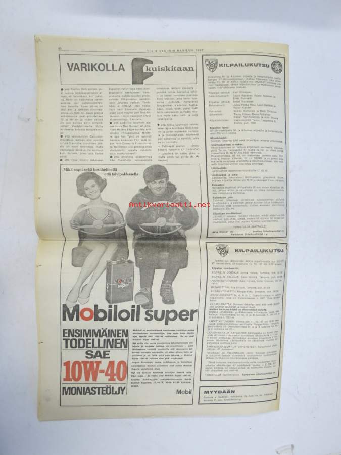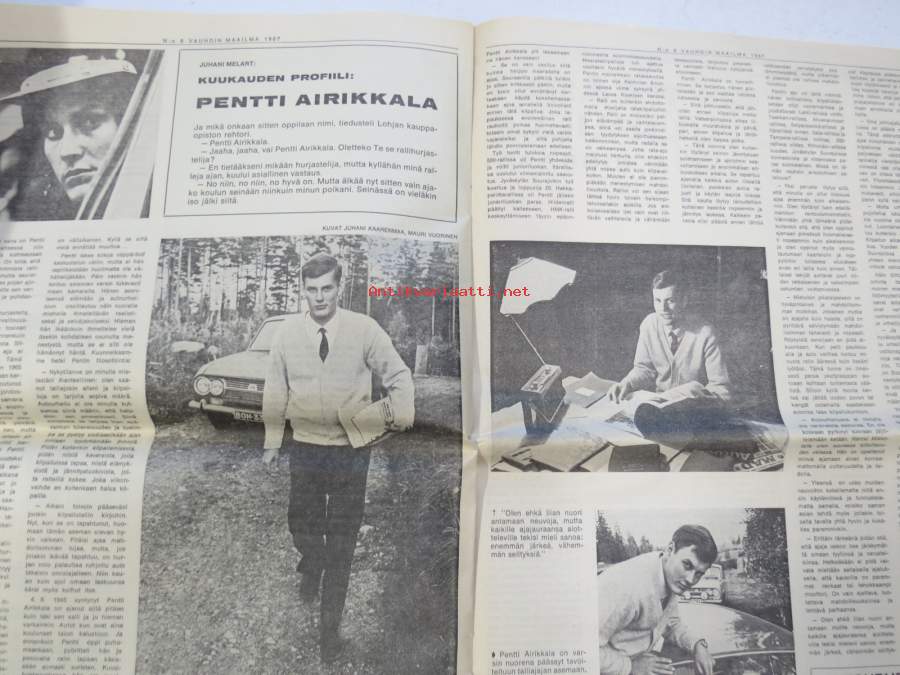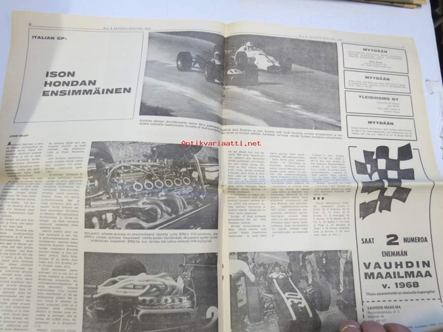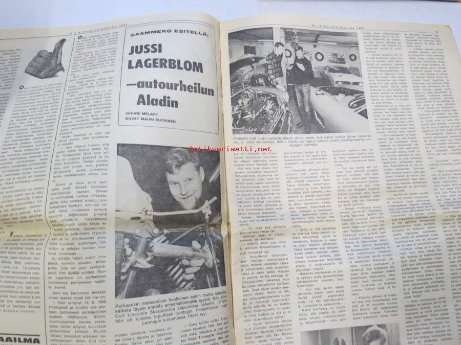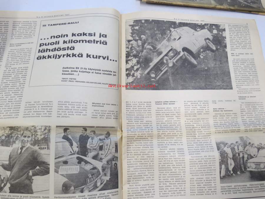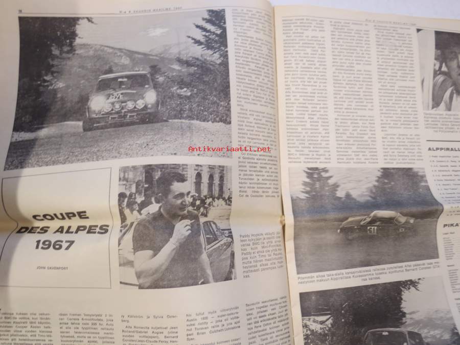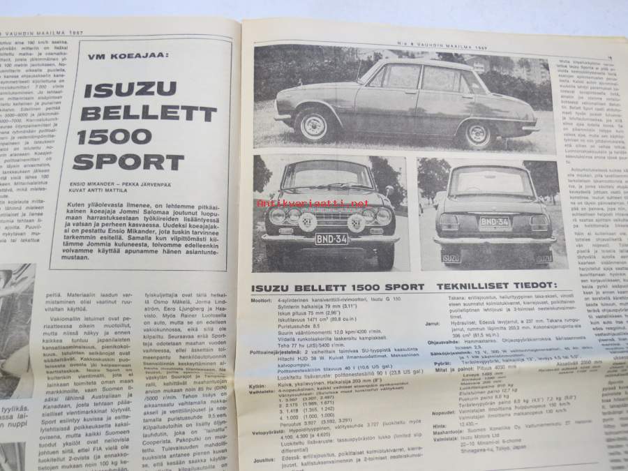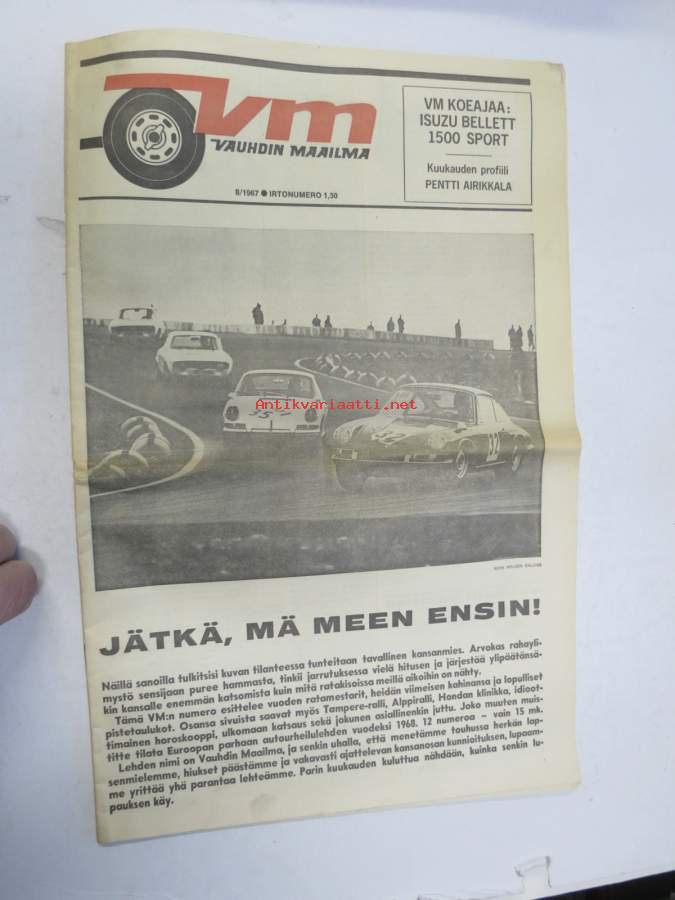Vauhdin maailma 1967 nr 8, sis. mm. seur. artikkelit / kuvat / mainokset; Jätkä mä meen ensin, Saammeko esitellä Jussi Lagerblom autourheilun Aladin, III Tampere-ralli... noin kaksi ja puoli kilometriä lähdöstä äkkijyrkkä kurvi..., Moottoriklinikka, Coupe des Alpes 1967, Isuzu Bellett 1500 sport tekniset tiedot ja kuvat, Rata-ajon SM 1967, F1 Italian GP ison Hondan ensimmäinen, Kuukauden profiili Pentti Airikkala, Amedee Gordinin 8-piippunen ase, katso sisältö kuvista tarkemmin.27 x 42 cm.