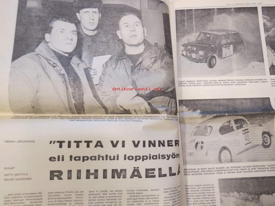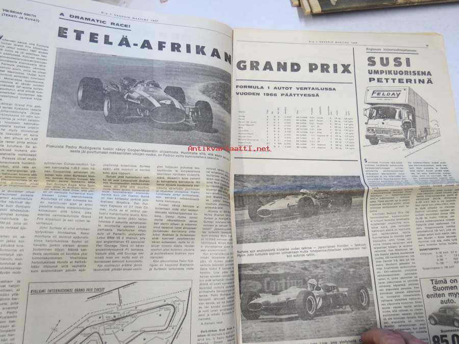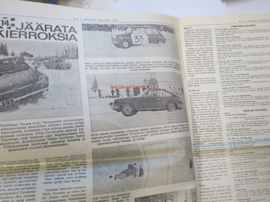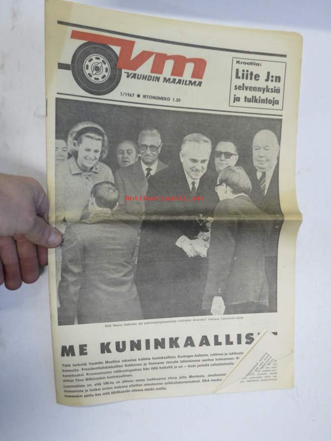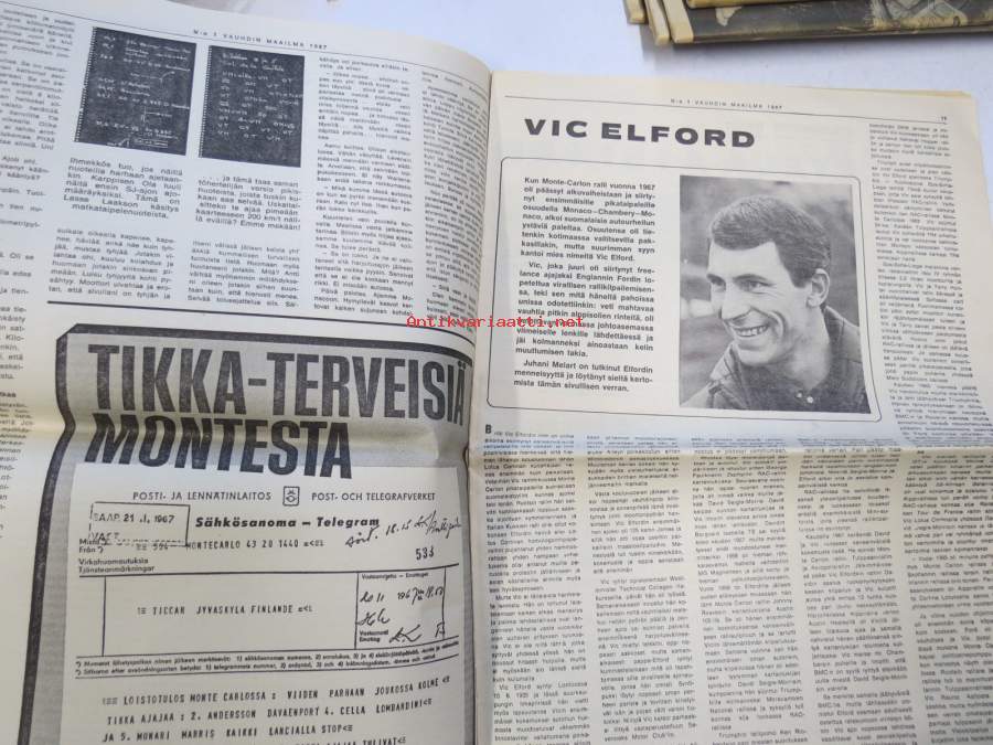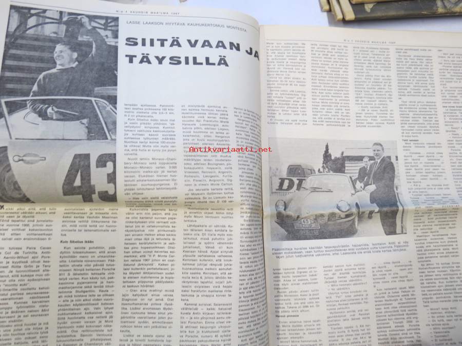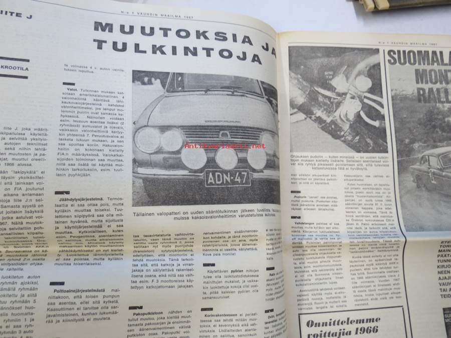 Vauhdin maailma 1967 nr 1, sis. mm. seur. artikkelit / kuvat / mainokset; Me kuninkaalliset, Casino Royale ja agentti 177 Rauno Aaltonen, Kävelykonsertti kolme voittajaa Timo Mäkinen 1965 Paddy Hopkirk 1964 Rauno Aaltonen 1967, Lumi löi Vicin Kivi löi Timon Ove löi Raunon mutta rauno voitti kaikki, Lasse Laakson hyytävä kertomus Montesta, Vic Elford, A Dramatic Race Etelä-Afrikan GP, Auto urheilumme pahapoika Klaus Bremer, Jääratakierroksia, katso sisältö kuvista tarkemmin