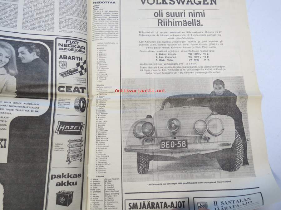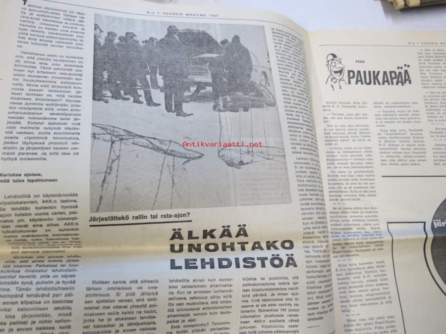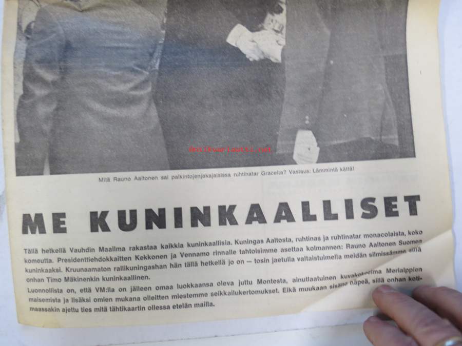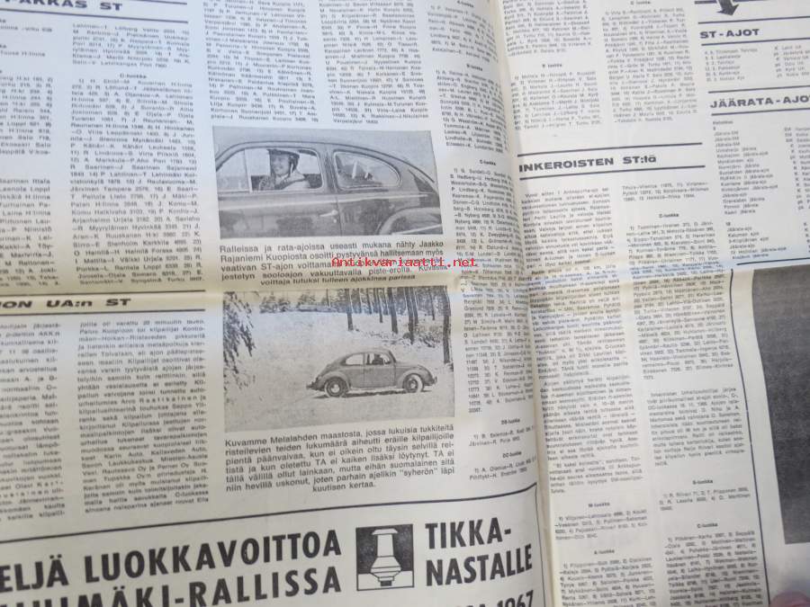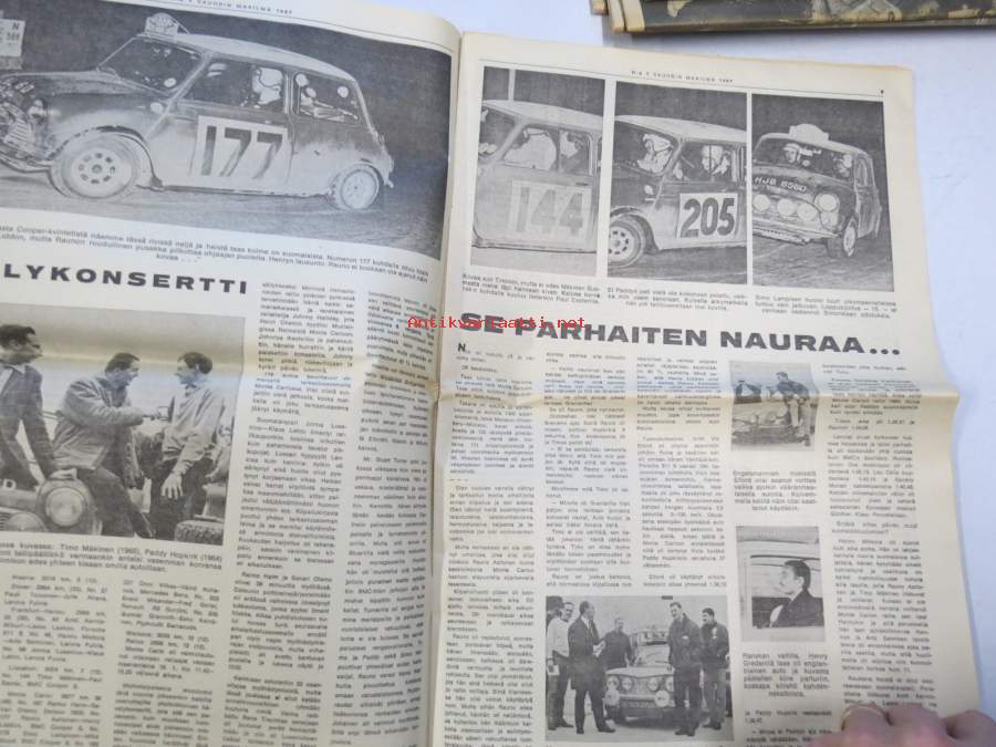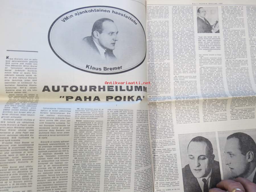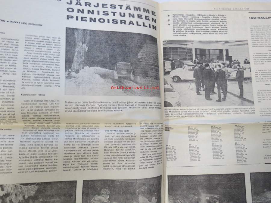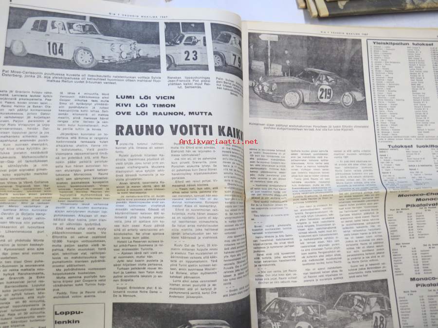 Vauhdin maailma 1967 nr 1, sis. mm. seur. artikkelit / kuvat / mainokset; Me kuninkaalliset, Casino Royale ja agentti 177 Rauno Aaltonen, Kävelykonsertti kolme voittajaa Timo Mäkinen 1965 Paddy Hopkirk 1964 Rauno Aaltonen 1967, Lumi löi Vicin Kivi löi Timon Ove löi Raunon mutta rauno voitti kaikki, Lasse Laakson hyytävä kertomus Montesta, Vic Elford, A Dramatic Race Etelä-Afrikan GP, Auto urheilumme pahapoika Klaus Bremer, Jääratakierroksia, katso sisältö kuvista tarkemmin