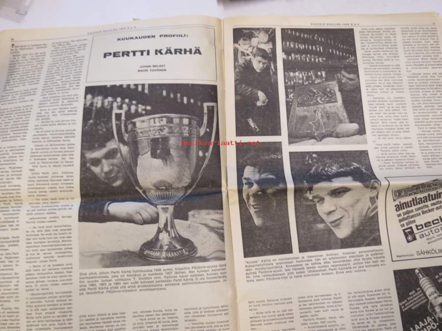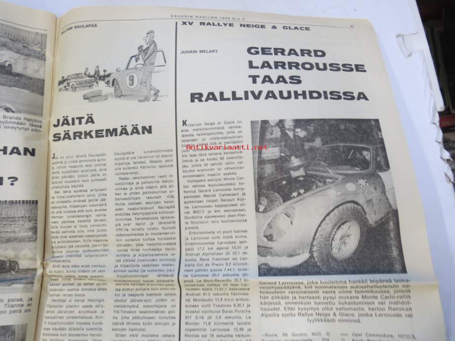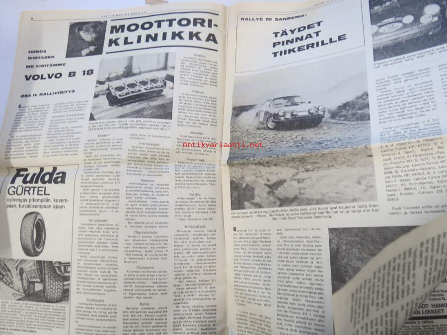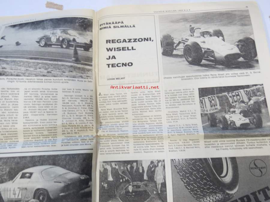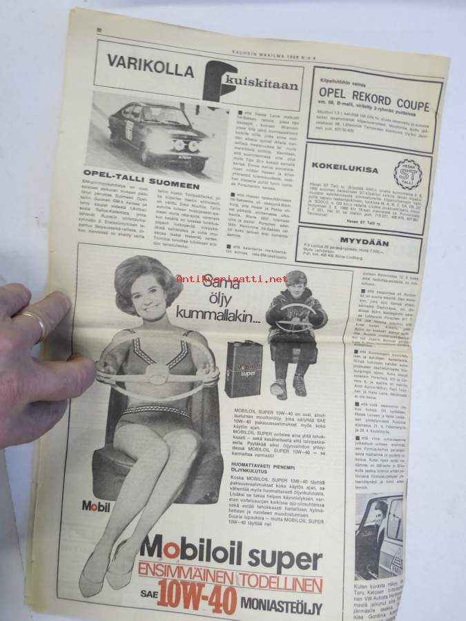 Vauhdin Maailma 1968 nr 4 sis. mm. seur. artikkelit / kuvat / mainokset; Esittelyssä Patricia Moss-Carlsson, III Napapiirin Tunturiralli, Parooni Huschke von