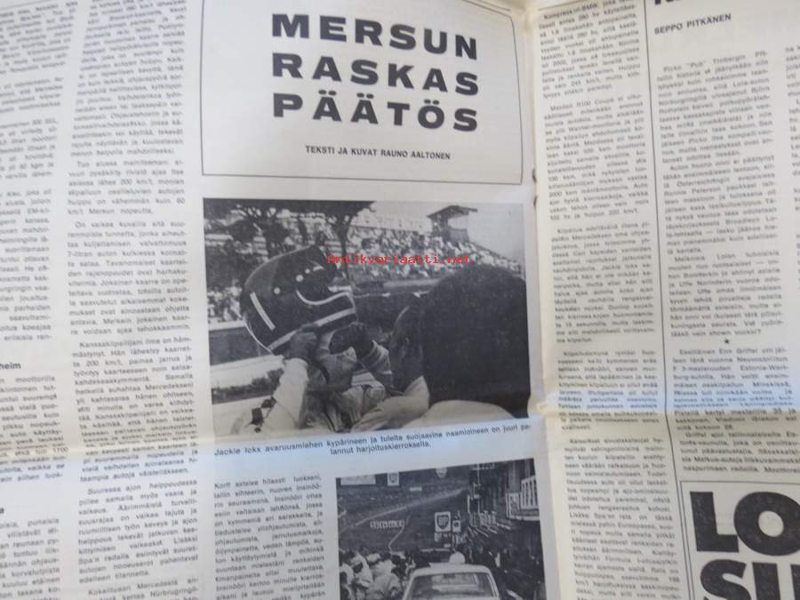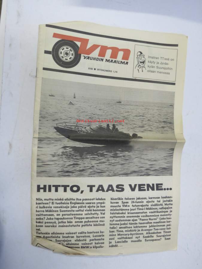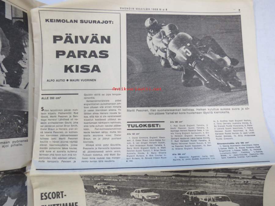 Vauhdin Maailma 1969 nr 8, sis. mm. seur. artikkelit / kuvat / mainokset; Brian Redman, Imatran Grand Prix, Escort-eliittimme Ruotsissa, Watkins Glen, Kuukauden profiili - Lasse Sirviö, Jorma Lusenius, Tapani Niinimäki, BMW:n kilpailuhistoria II, Rauno Aaltonen - Mersun raskas päätös, Melkus Wartburg F-3, Jyväskylän aattona, Taistelua ratakuolemaa vastaan, ym.