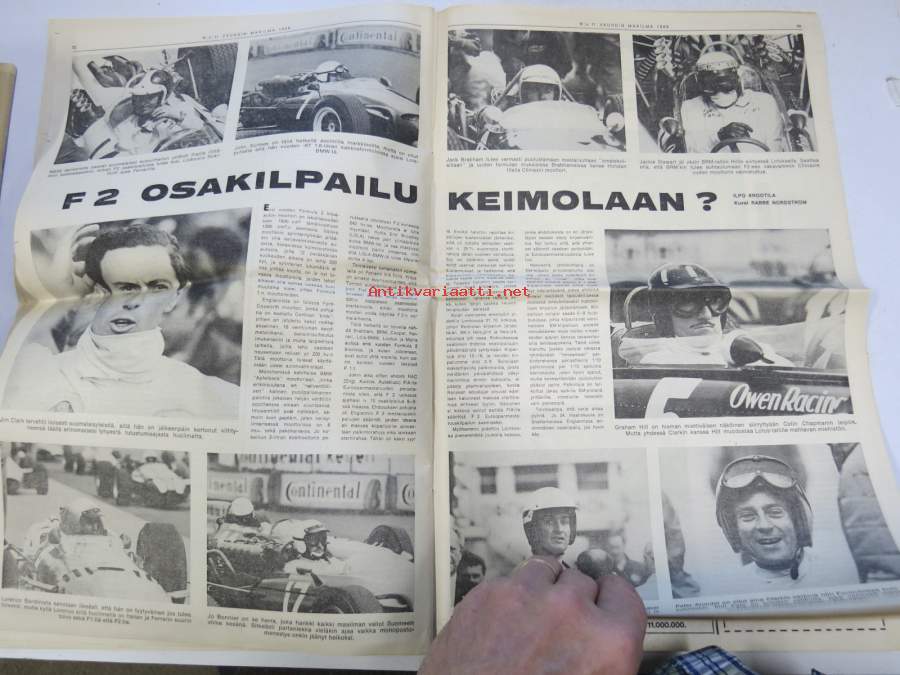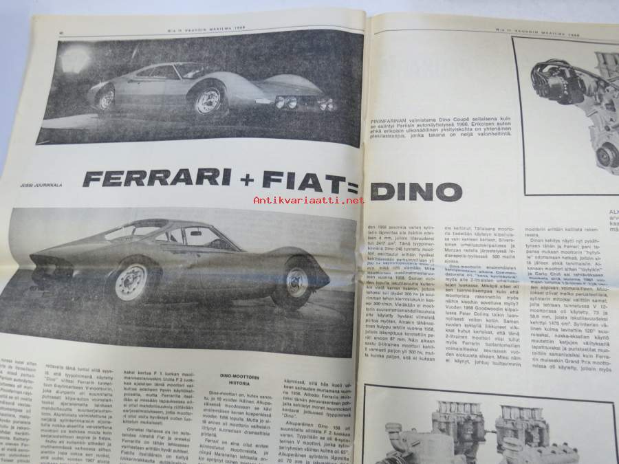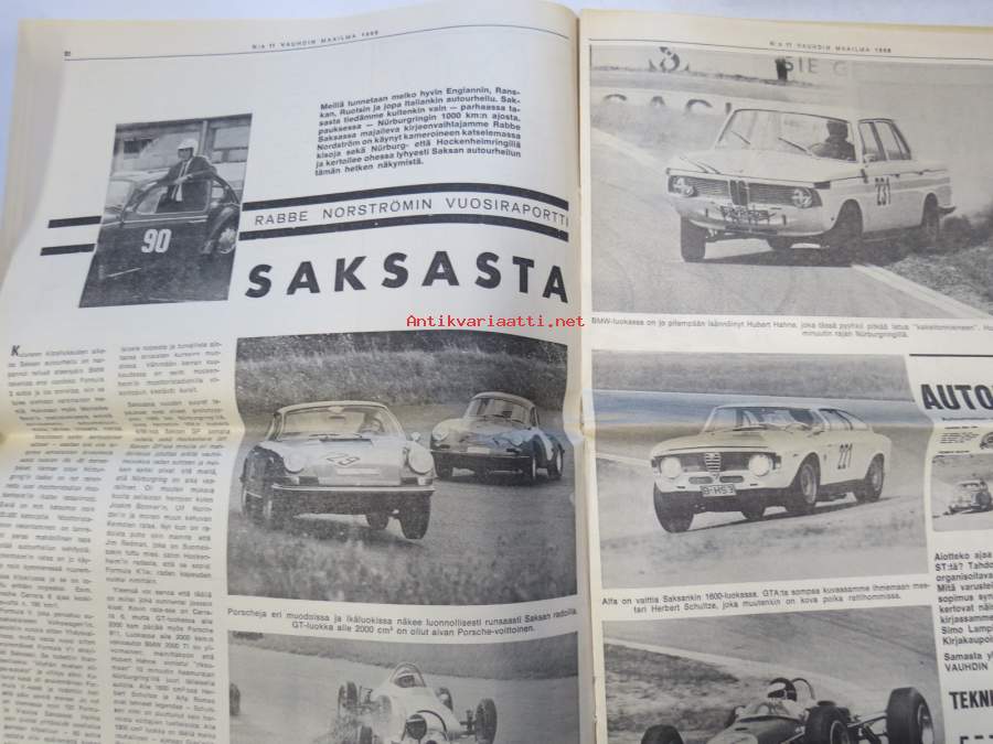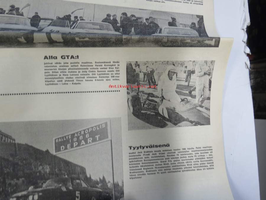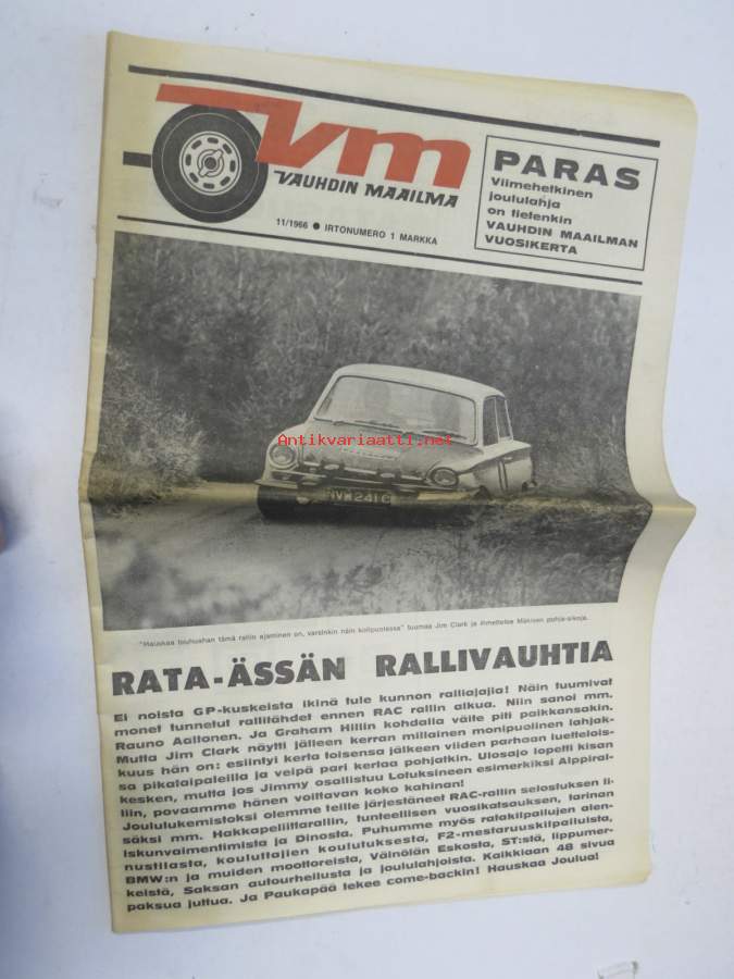 Vauhdin Maailma 1966 nr 11 -mm. Rata-ässän rallivauhtia, Ruiskeita suoraan suoneen 5r, Tirkistelyä taustapeiliin Hannu Mikkola Simo Lampinen Raimo Kossila Antti Aarnio-wihuri Klaude Bremer Lasse Koskinen Alfa GTA Jorma Lucenius, Söderströmin syntymäpäivä eli Ruotsalaisten Englanninralli, RAC-Ralli 1966 tulokset, Tie tasaiseksi ja tassut maahan muutama sana iskunvaimentimista, Rabbe Norströmin vuosiraportti Saksasta, Autourheilun kahdeksat ratakulissit, F2 Honda lähtee BMW tulee, F2 osakilpailu Keimolaan?, Hakkapeliitat ja heidän proteesinsa, Joulupukin pikataival, Ferrari+Fiat=Dino, Opel Rallye Kadett, Mestari pelasti mestarin Goodwoodin mustana päivänä. 27 x 42 cm.
