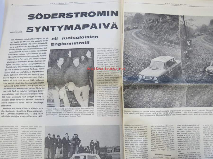 Vauhdin Maailma 1966 nr 11 -mm. Rata-ässän rallivauhtia, Ruiskeita suoraan suoneen 5r, Tirkistelyä taustapeiliin Hannu Mikkola Simo Lampinen Raimo Kossila Antti