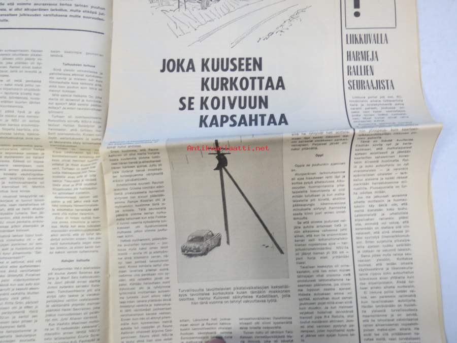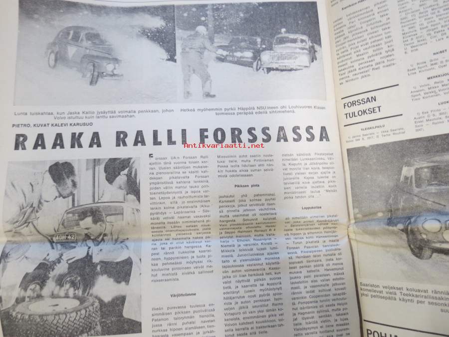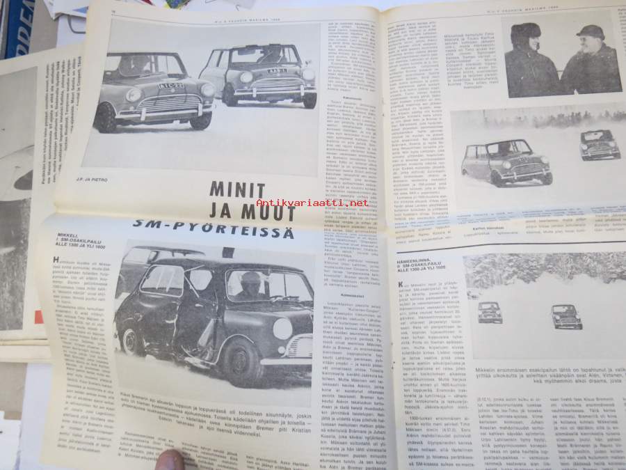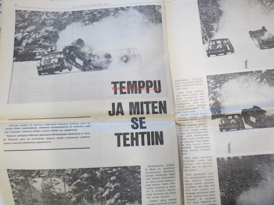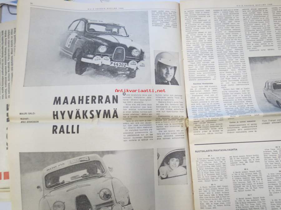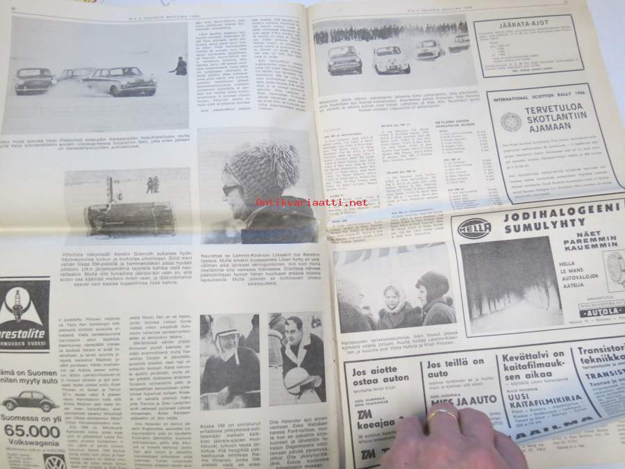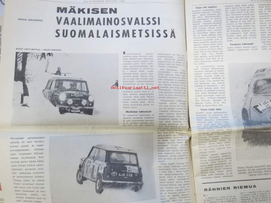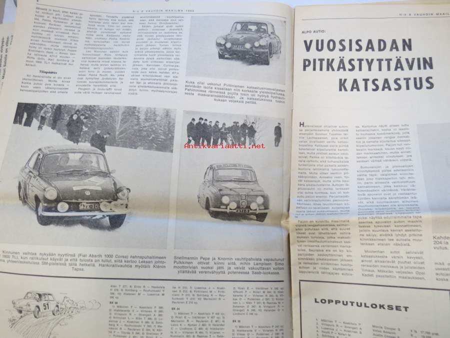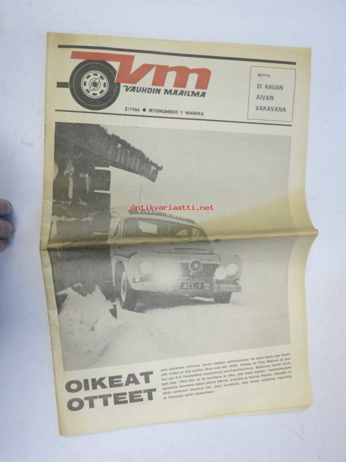 Vauhdin maailma 1966 nr 2, sis. mm. seur. artikkelit / kuvat / mainokset; Ranskalaislehti Monte Carlon jälkeen Timo Mäkinen Le Vrai Vainqueur, Timo Mäkisen Vaalimainosvalssi Suomalaisissa metsissä, Sytytystulpat testissä, Maaherran hyväksymä ralli KAK, Hii-op hetkiä Hankirallissa, Minit ja muut SM- pyörteissä, SM-Jäärata Mikkeliossä ja temppu miten se tehtiin Lahdesta voi noutaa Kattokerhon jäsenmerkin, Jäärata kierroksia Parikkala Kitee Lappijärvi Ruovesi Halikko Petäjävesi Urjala, XI Teekkariralli, Forssan raaka ralli, Suomalaisten juhlaa Sveitsin rallissa, katso sisältö kuvista tarkemmin. 27 x 42 cm.